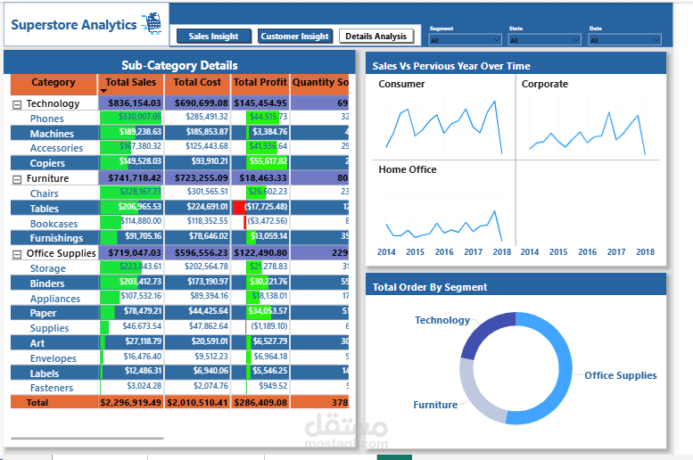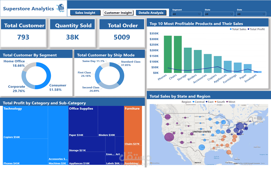 شرائح العملاء: تحليل أداء كل شريحة (مستهلك، شركة، قطاع حكومي) وأنماط الشحن المفضلة لديهم.