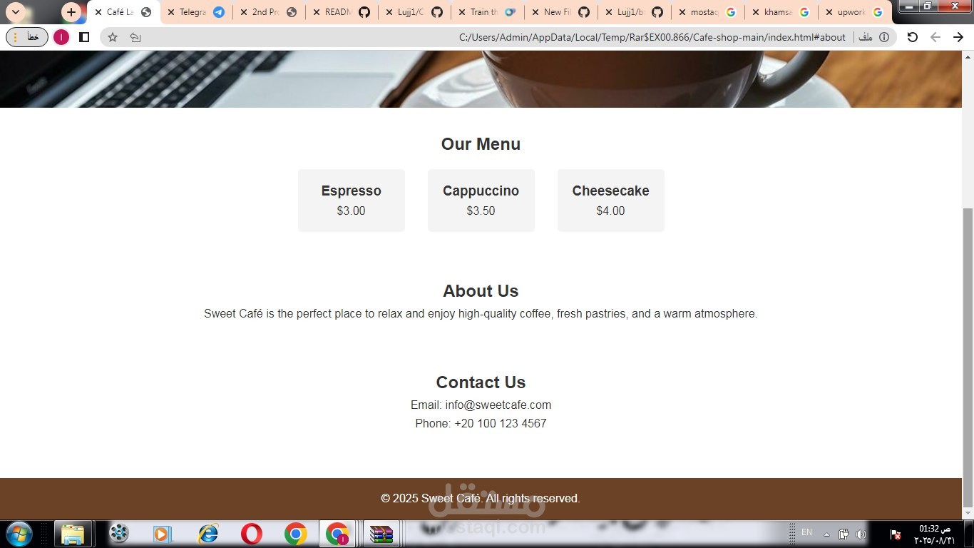 صفحة هبوط بسيطة لمطعم/كافيه بتعرض القائمة، نبذة تعريفية، ووسائل التواصل. التصميم معمول بـ HTML و CSS وبيشتغل بشكل متجاوب على كل الأجهزة.