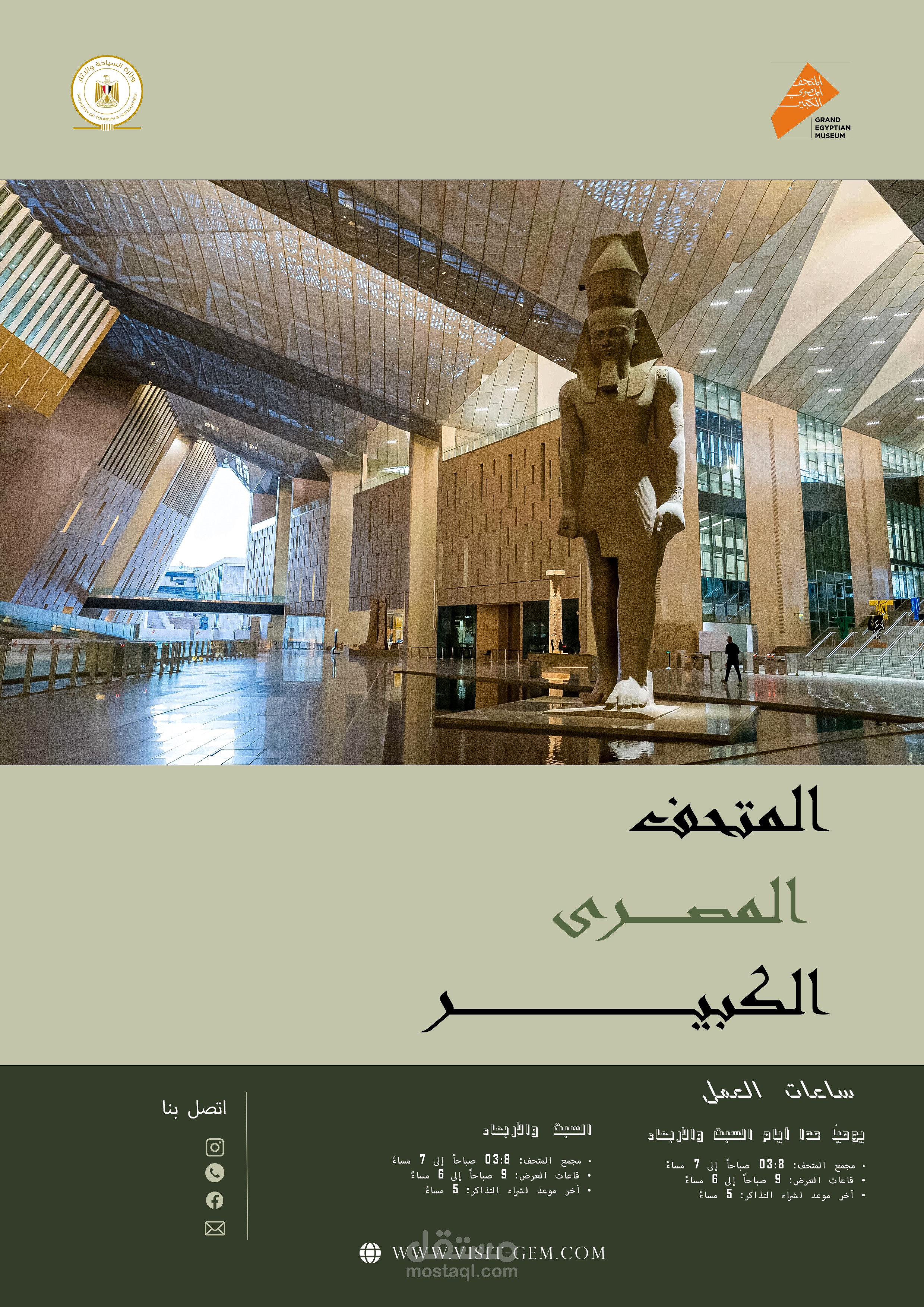 الرسالة واضحة: "المتحف المصري الكبير هو بوابتك لعظمة الحضارة المصرية"، مع إبراز المواعيد والموقع الإلكتروني لسهولة الوصول.
