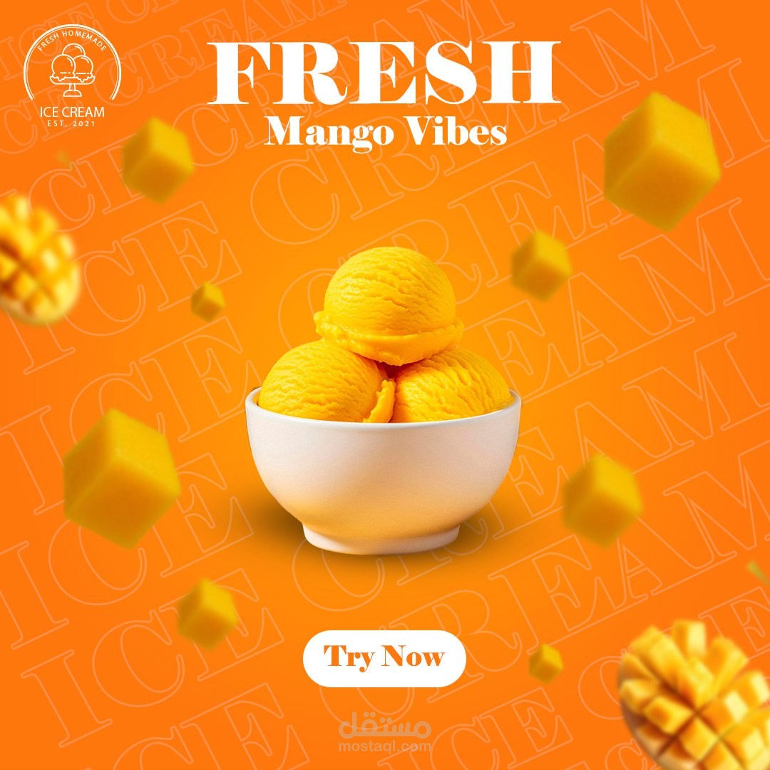 اعلان سوشيال ميديا لمنتج ايس كريم بنكهه المانجا يجتوي علي المنتج في نصف الاعلان وكلمه ايس كريم بالانجليزي بالعرض كخلفيه مع خلفيه اللون البرتقالي وقطع من المانجا حول المنتج