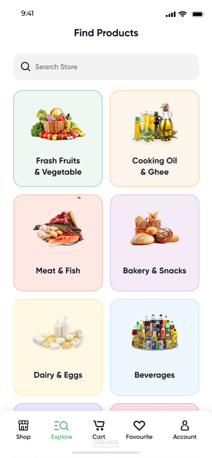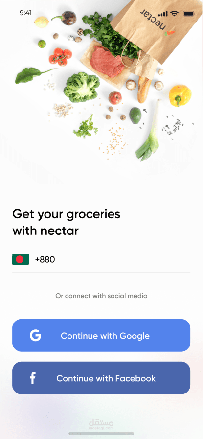 هو تطبيق موبايل مخصص للتسوق الإلكتروني للبقالة، مبني بواجهة استخدام (UI) بسيطة وسلسة وتجربة مستخدم (UX) محسنة. التطبيق يدعم: