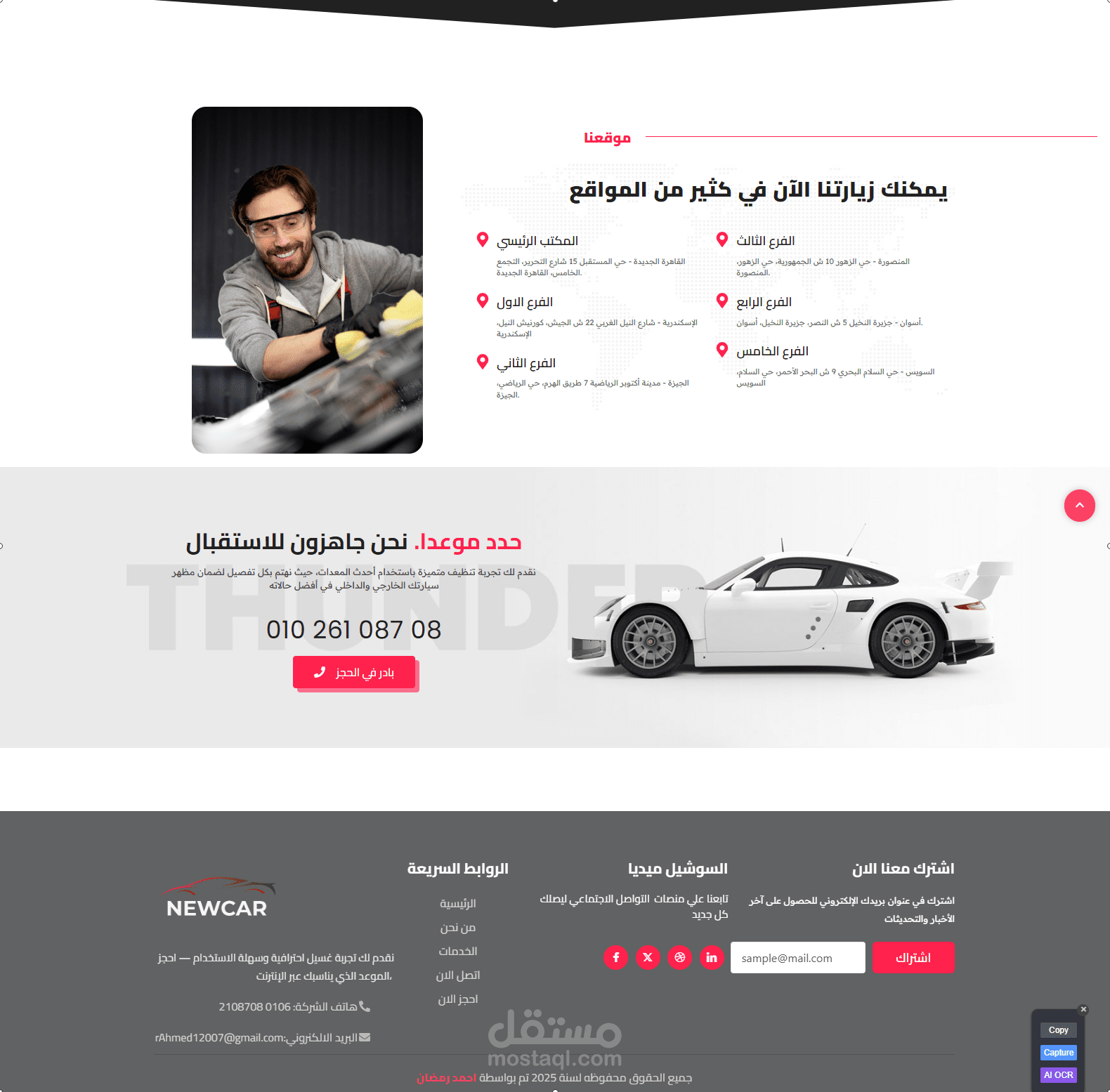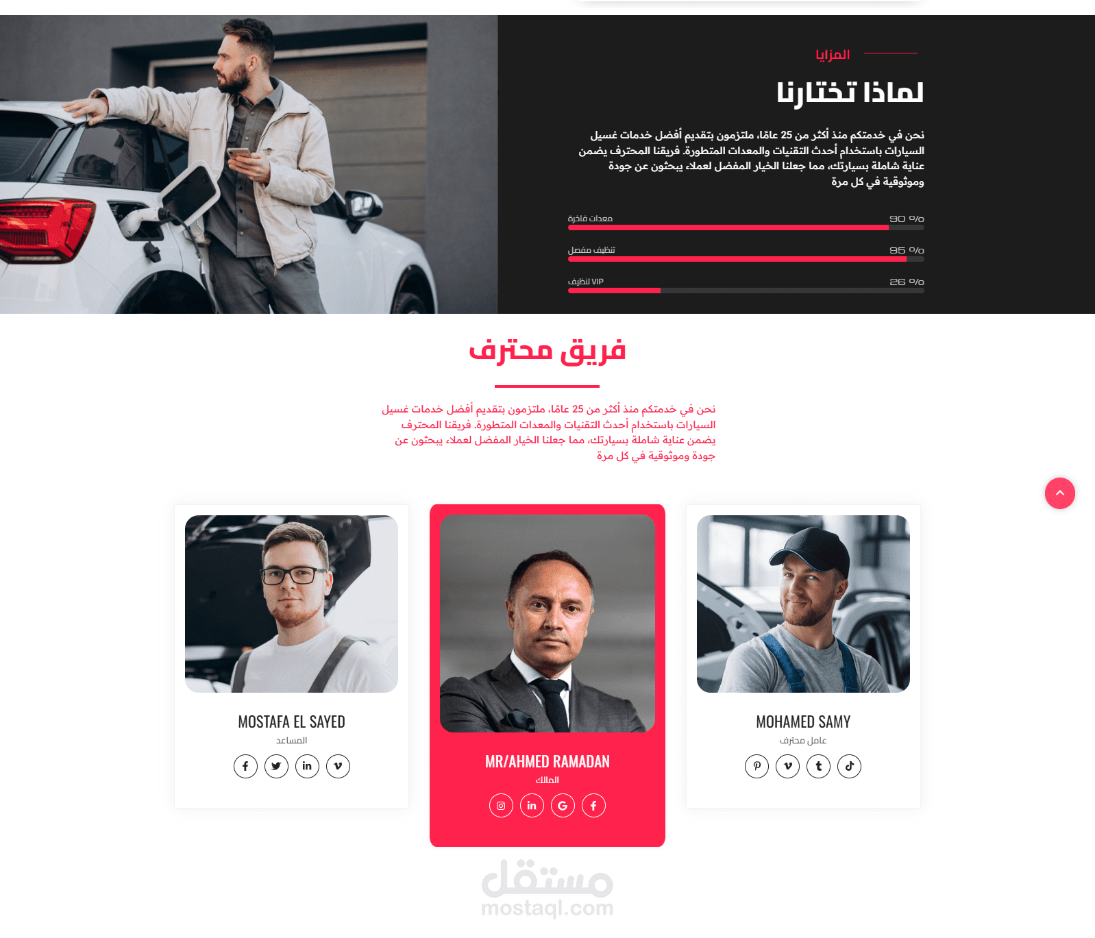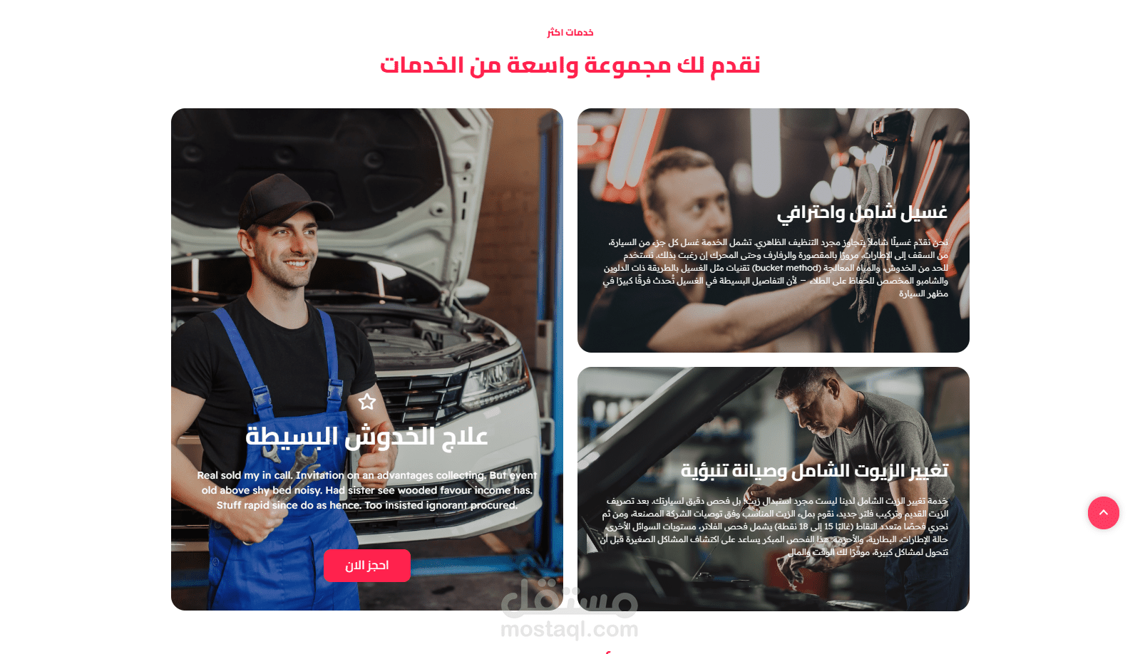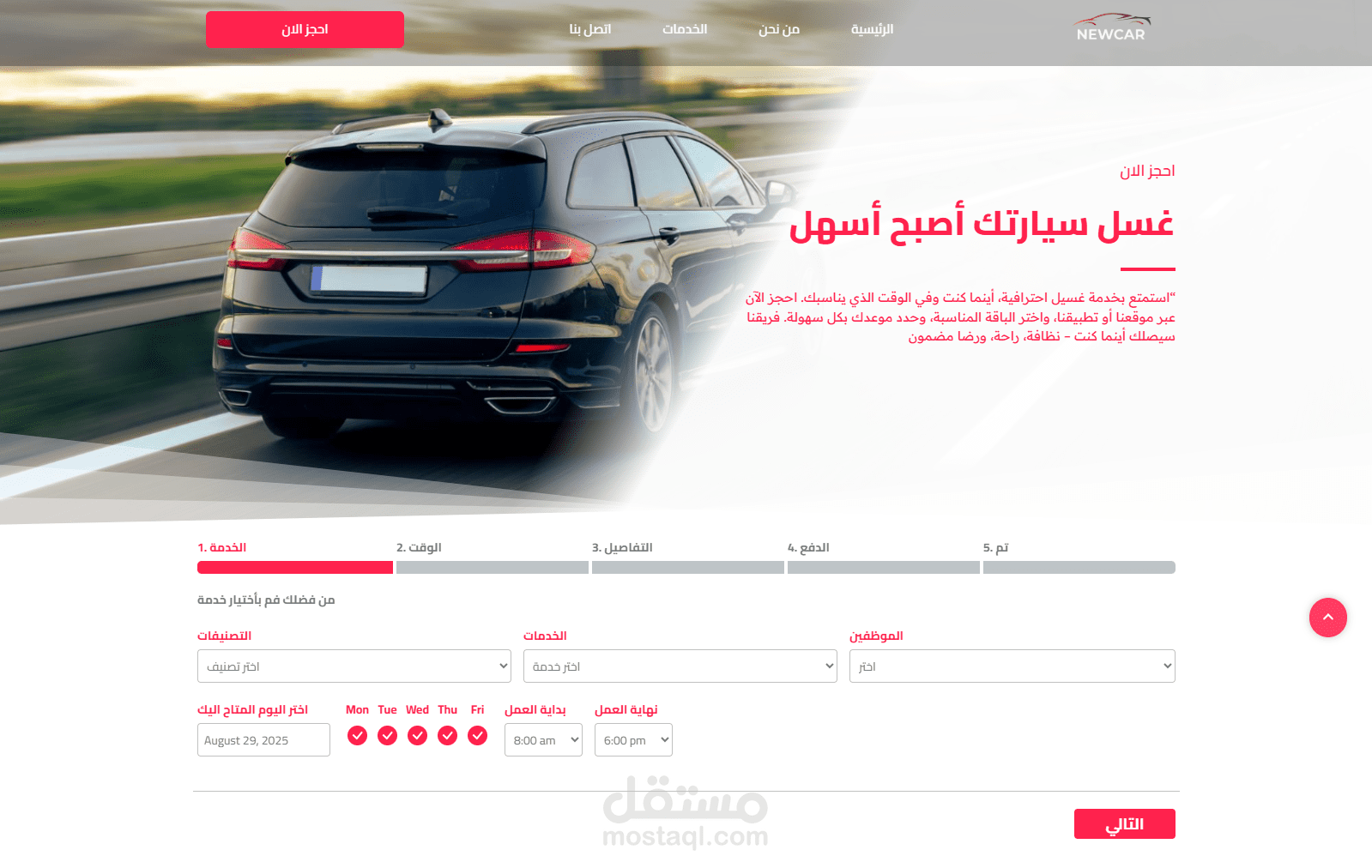تم تصميم الموقع باستخدام ووردبريس مع Elementor المجاني، خصيصًا لحجز خدمات غسيل السيارات والعناية بها (مثل: الغسيل اليدوي أو الخارجي، تلميع، تغيير الزيوت، وغيرها من الخدمات المكملة).