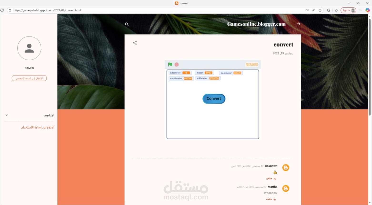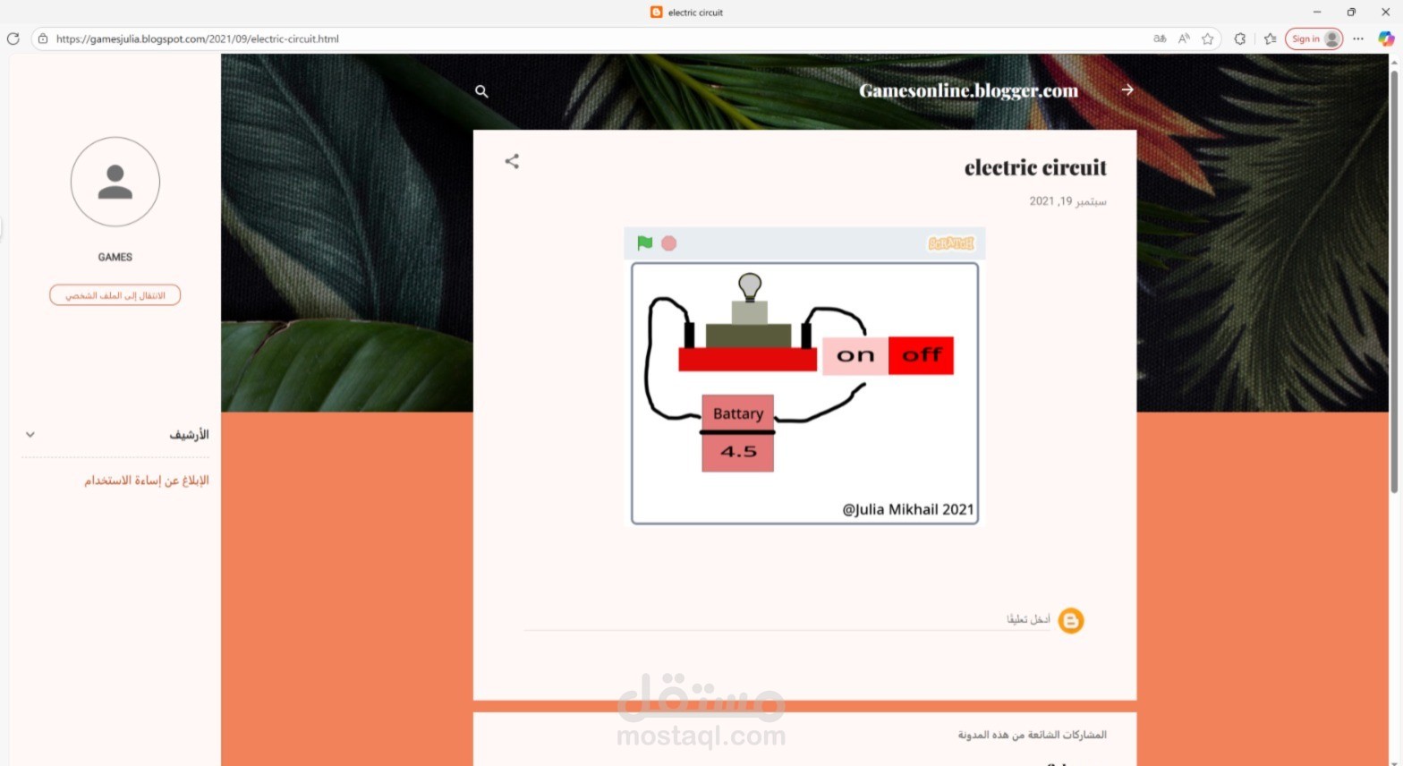 موقعي "Games Julia" هو مدونة متخصصة في عالم ألعاب الأطفال، أقدم فيها مجموعة من الألعاب التفاعلية الممتعة و المفيدة لتنمية المهارات. الفكرة من الموقع هي خلق مساحة آمنة ومسلية يقدر الأطفال من خلالها يستمتعوا بألعاب بسيطة، خفيفة، وسهلة الاستخدام، بعيدًا عن التعقيد أو المحتوى غير المناسب و تفيدهم في دراستهم .