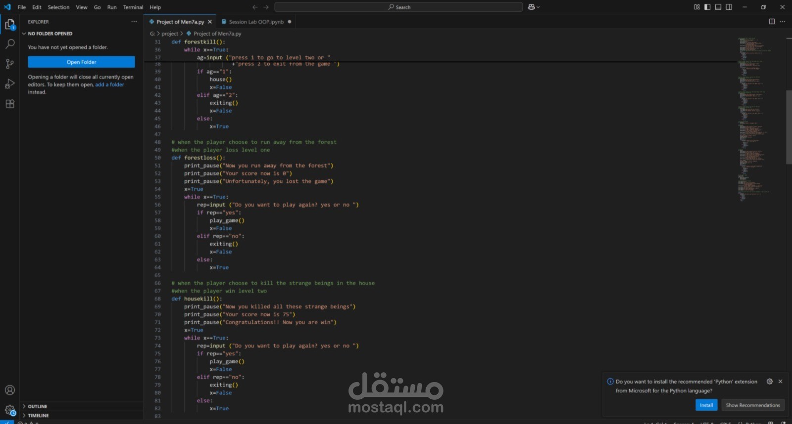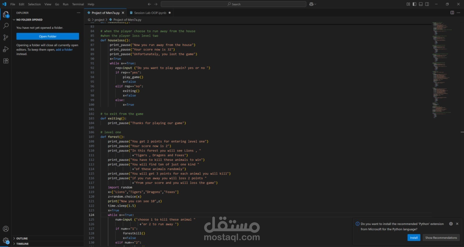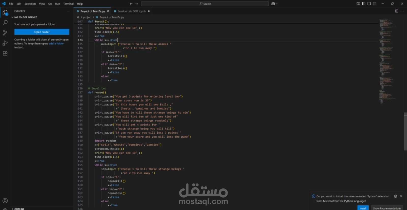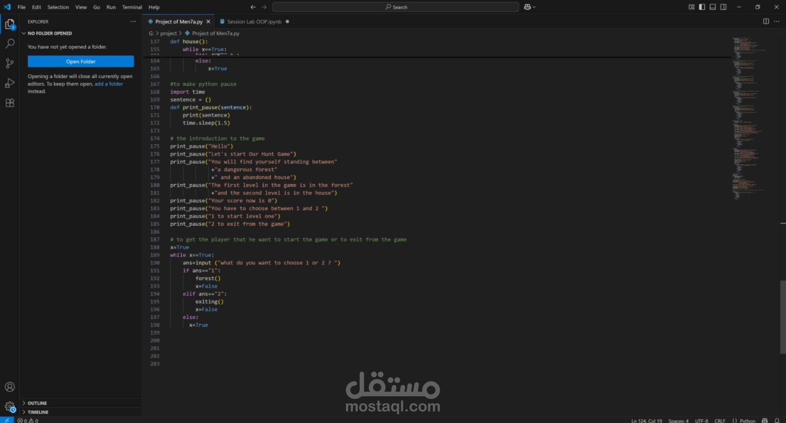 مشروع Hunt Game هو لعبة مغامرات نصيّة بلغة Python، تم تصميمها لتقديم تجربة مشوّقة تجمع بين الترفيه واتخاذ القرارات الذكية. تبدأ القصة حين يجد اللاعب نفسه في موقف غامض بين غابة خطرة وبيت مهجور مليء بالمخلوقات الغريبة.و عليه الاختيار الغابة ام البيت المهجور و المواجهة او الهروب .