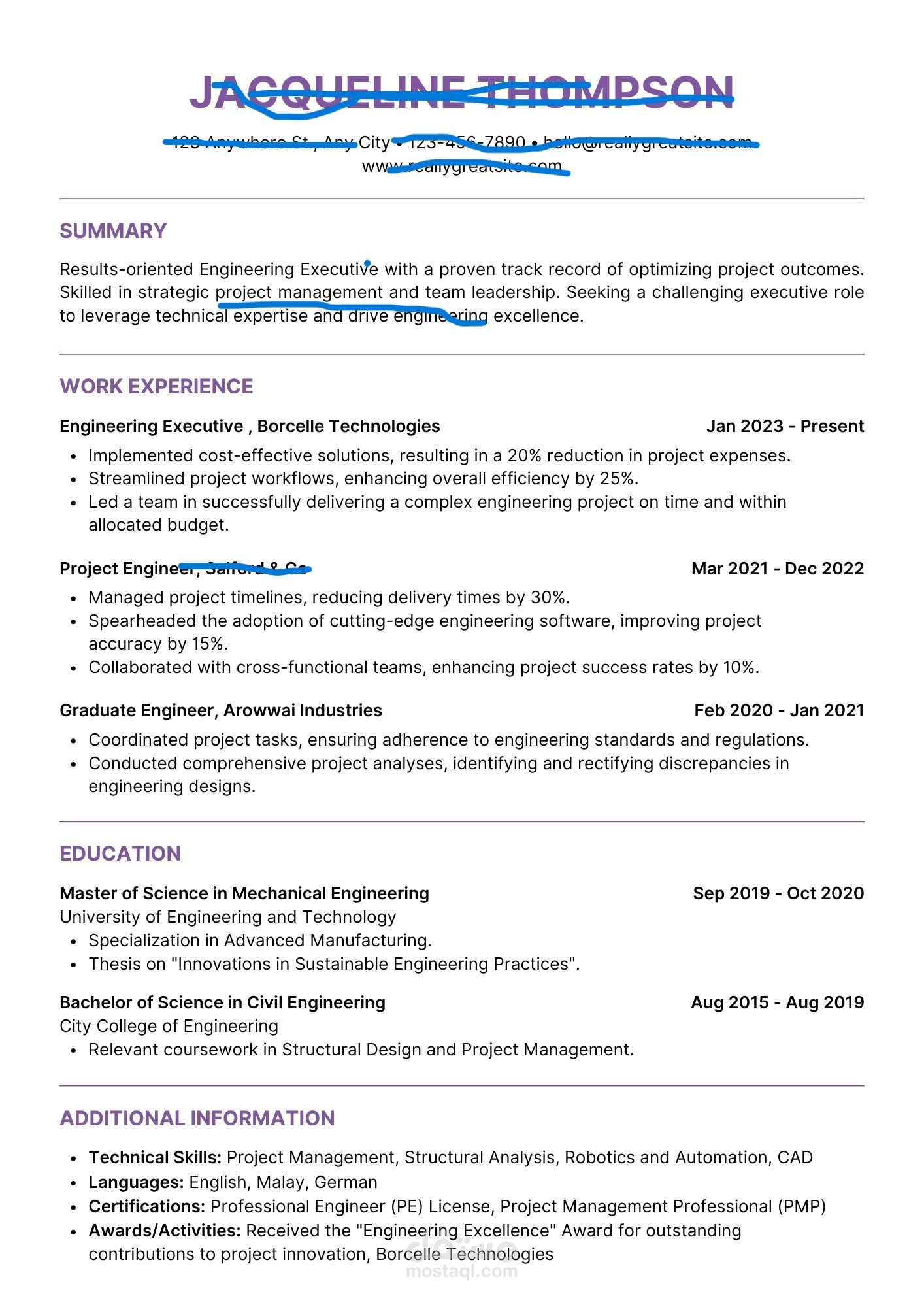 – تنسيق كامل للأقسام: البيانات الشخصية – الملخص المهني – التعليم – الخبرات – المهارات – الدورات – وسائل التواصل.