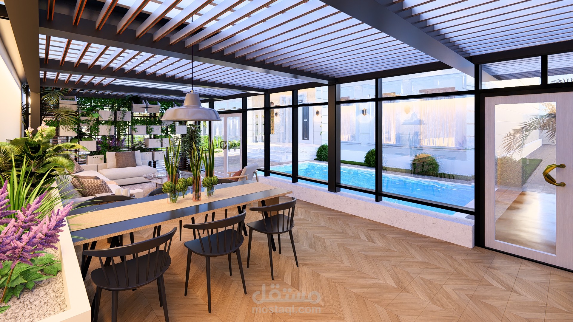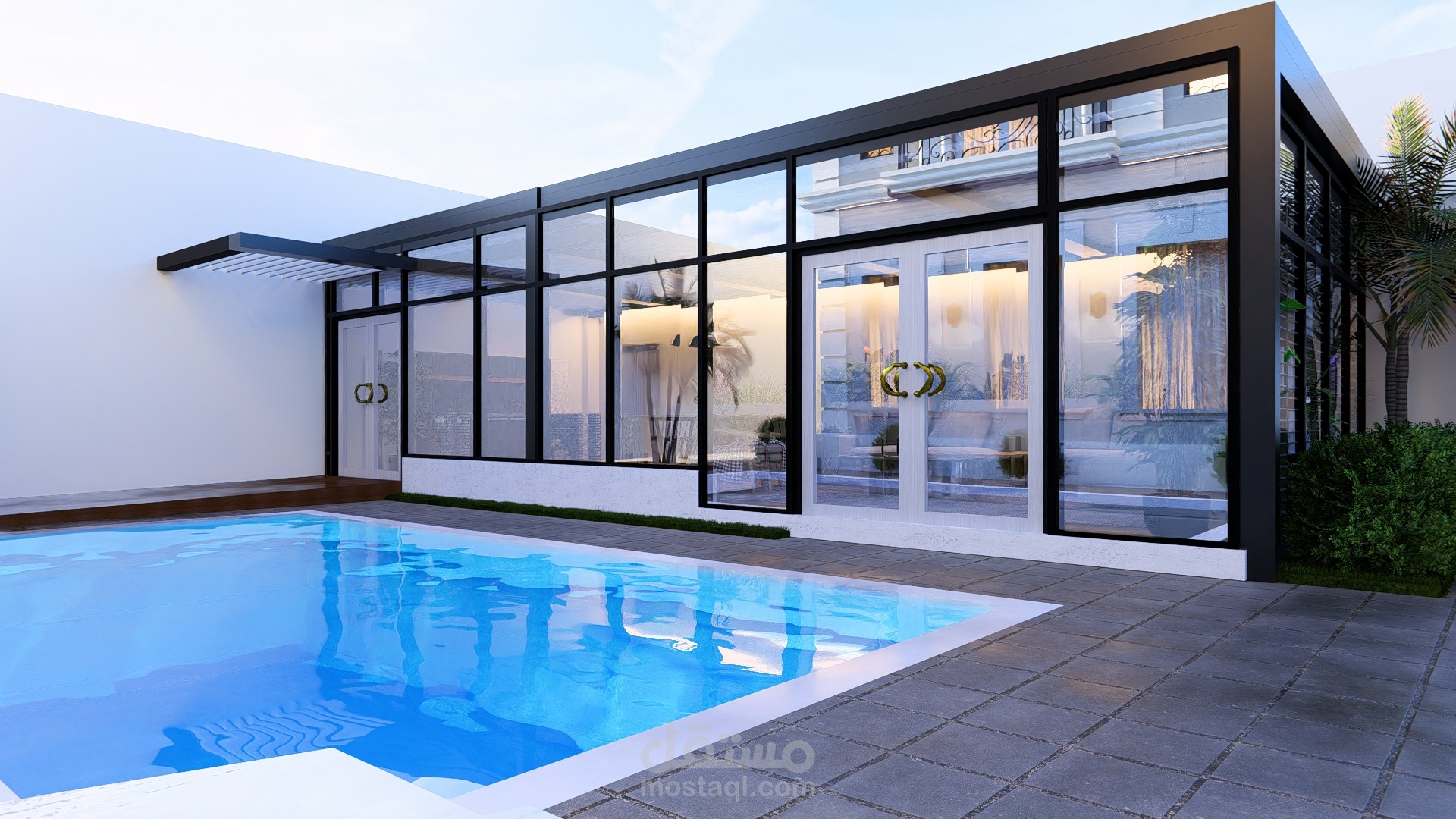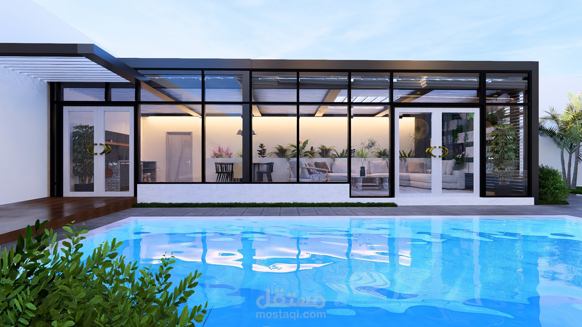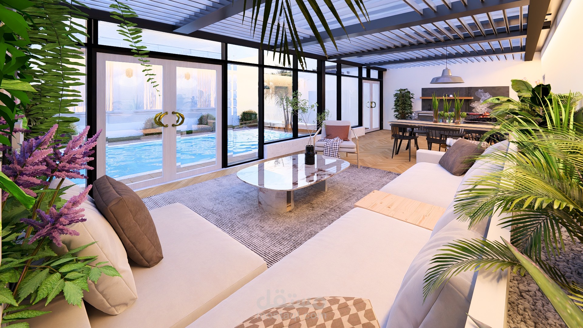 مجلس خارجي أنيق مغطى بالزجاج بإطلالة مباشرة على مسبح عصري محاط برخام فاتح، تحيط به حديقة صغيرة منظمة تضفي لمسة طبيعية وراحة للمكان.