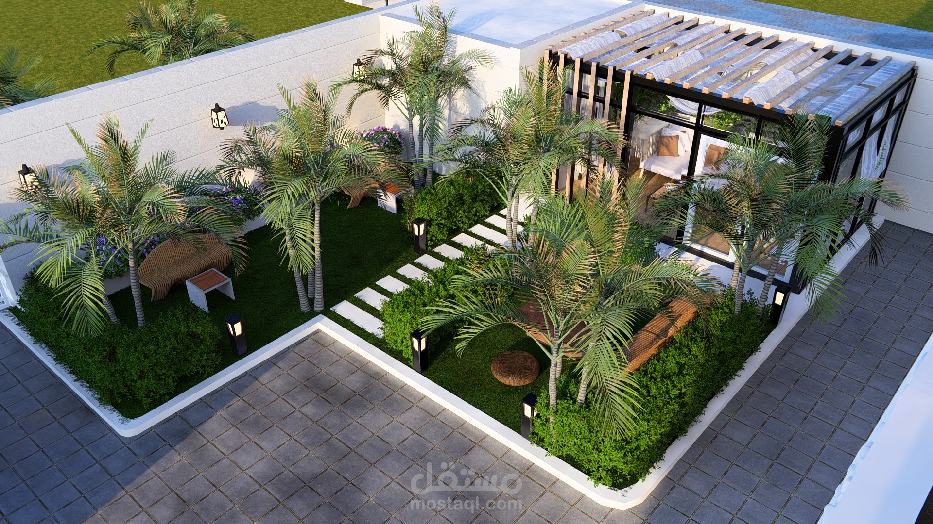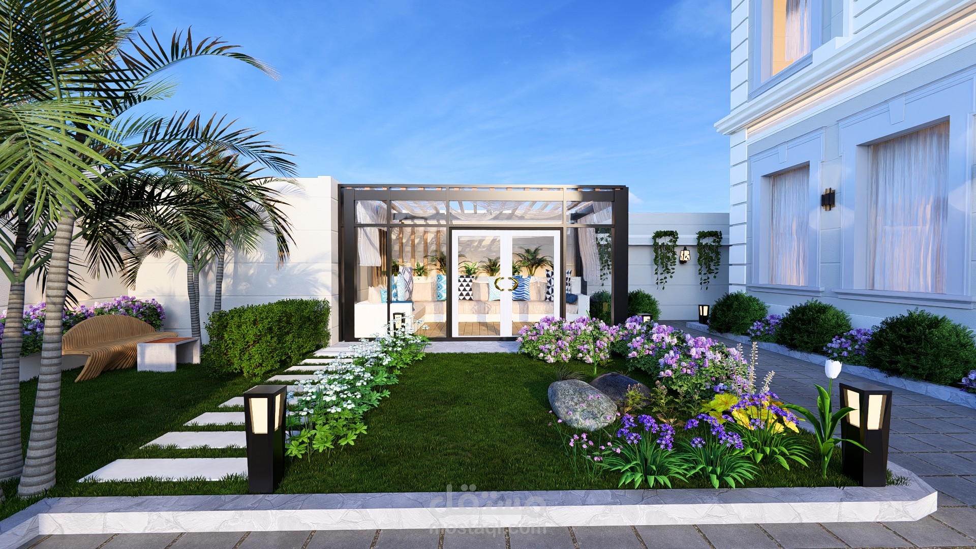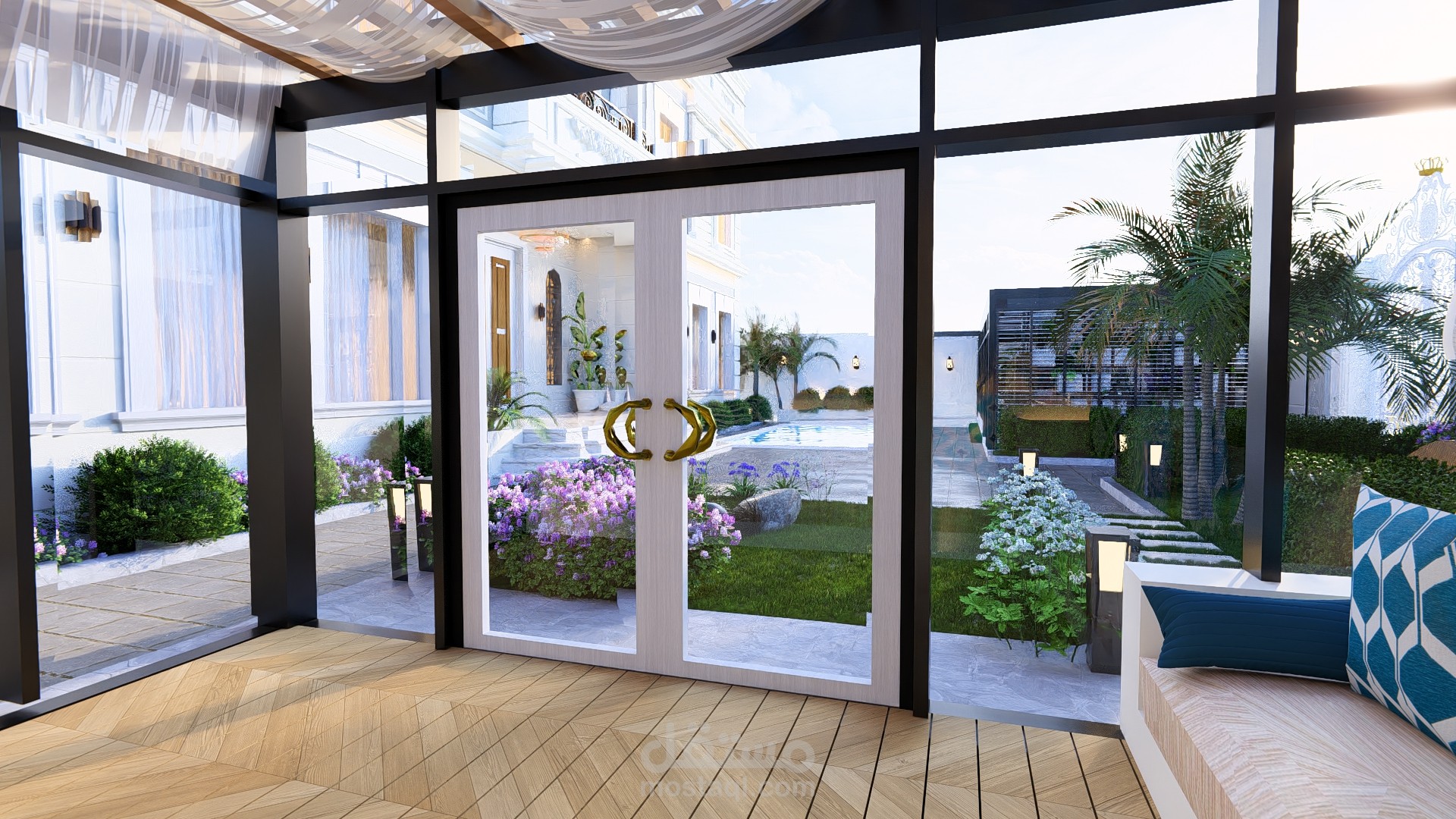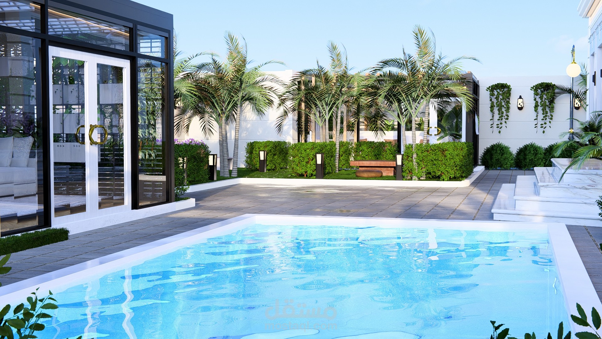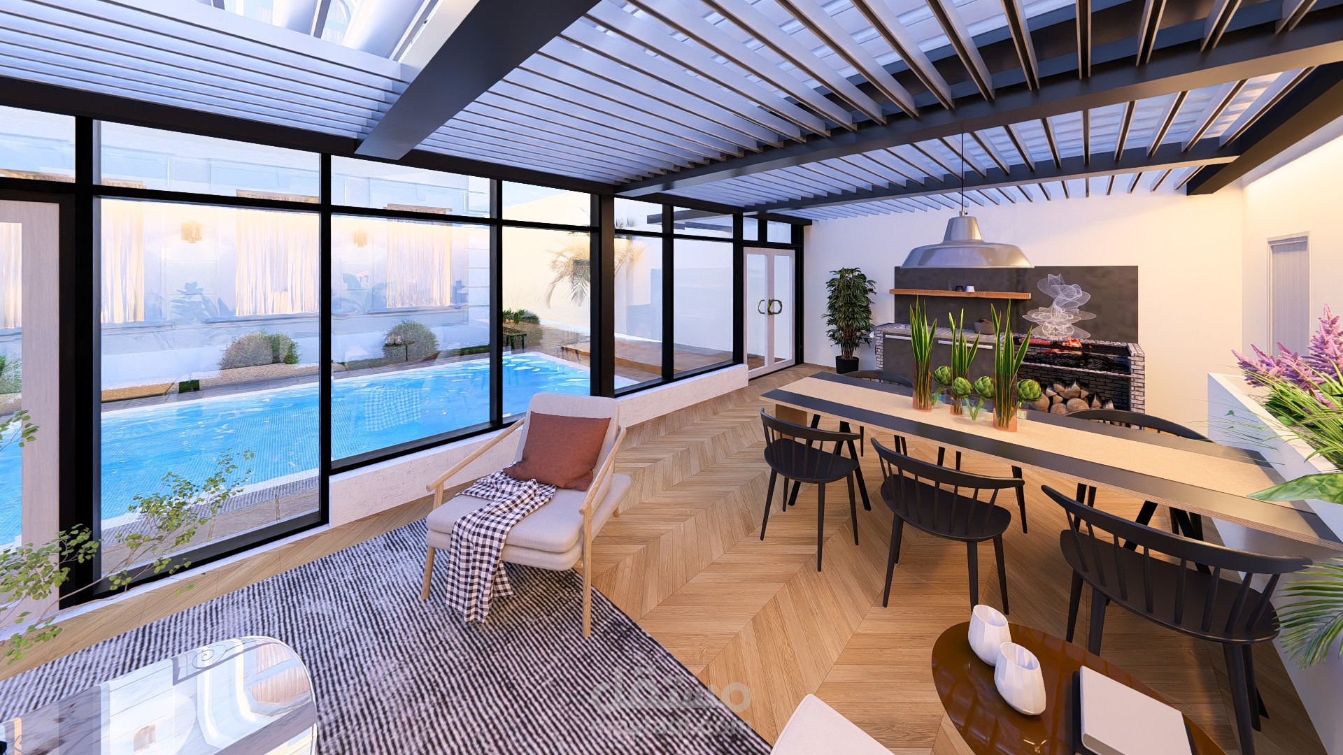 مجلس خارجي أنيق مغطى بالزجاج بإطلالة مباشرة على مسبح عصري محاط برخام فاتح، تحيط به حديقة صغيرة منظمة تضفي لمسة طبيعية وراحة للمكان.