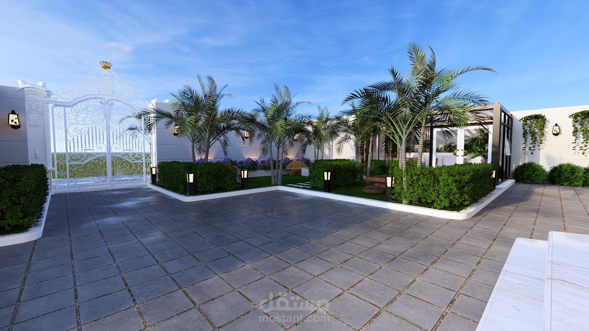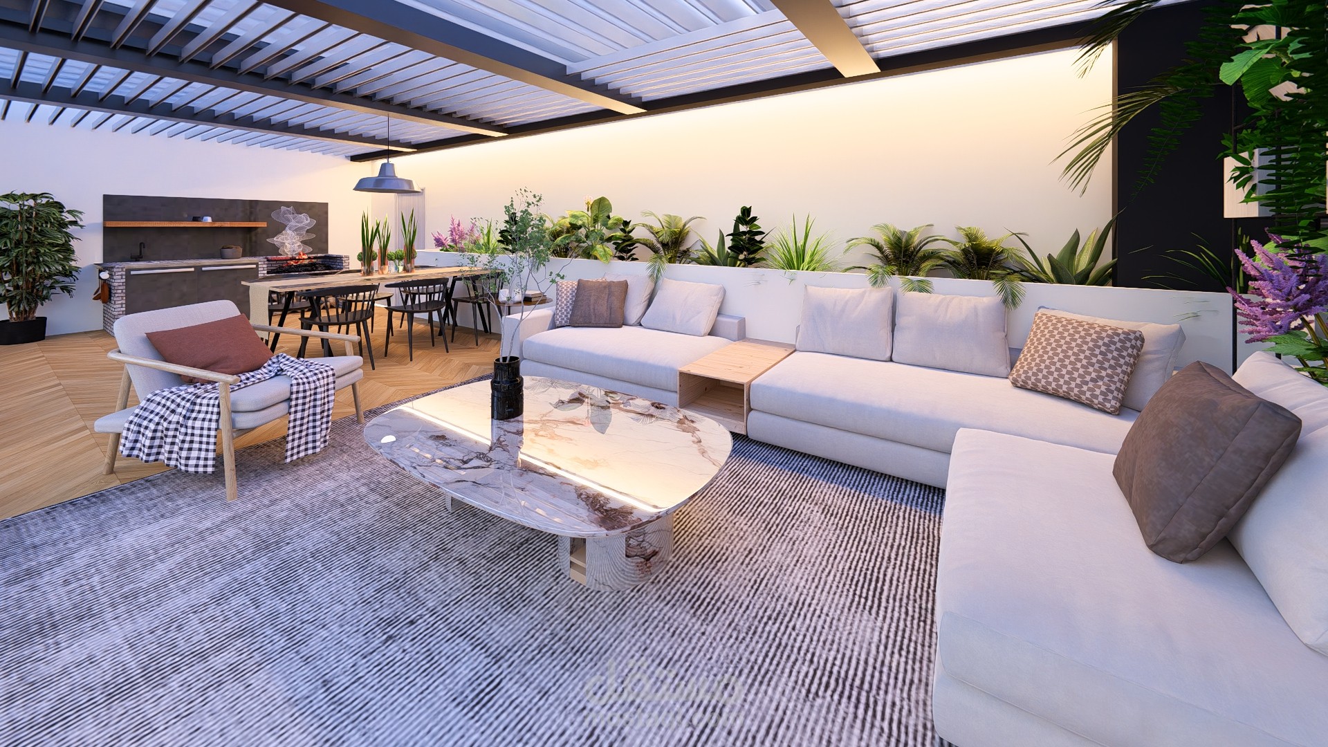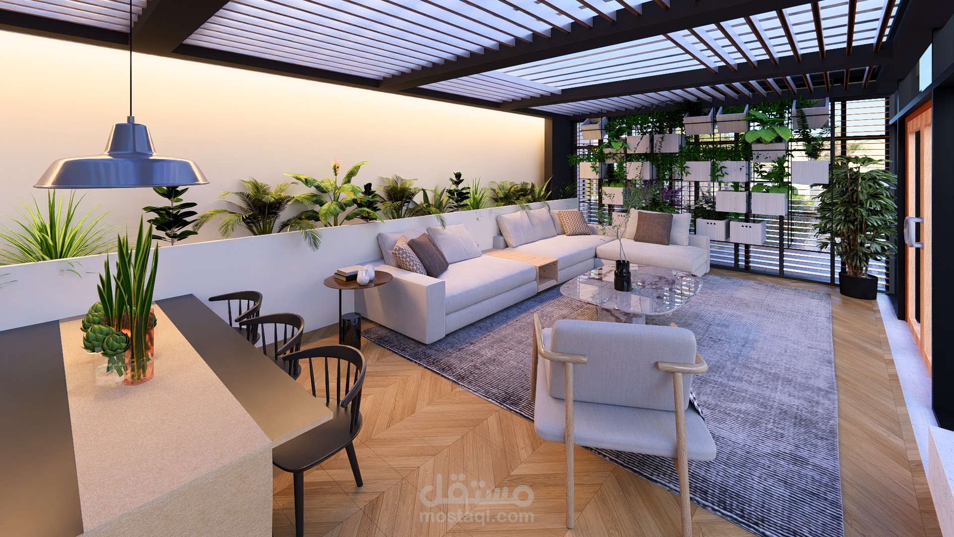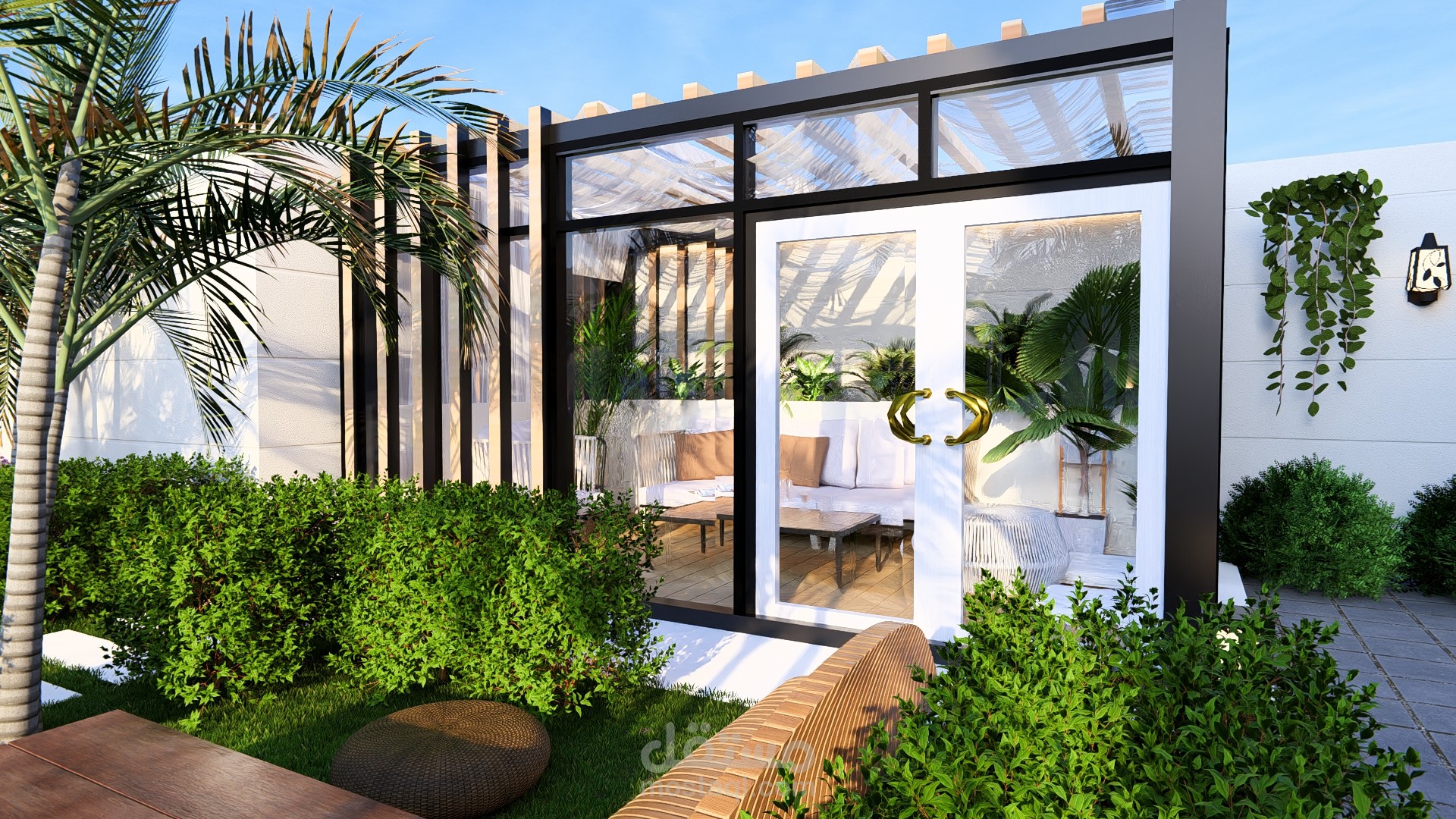 مجلس خارجي أنيق مغطى بالزجاج بإطلالة مباشرة على مسبح عصري محاط برخام فاتح، تحيط به حديقة صغيرة منظمة تضفي لمسة طبيعية وراحة للمكان.
