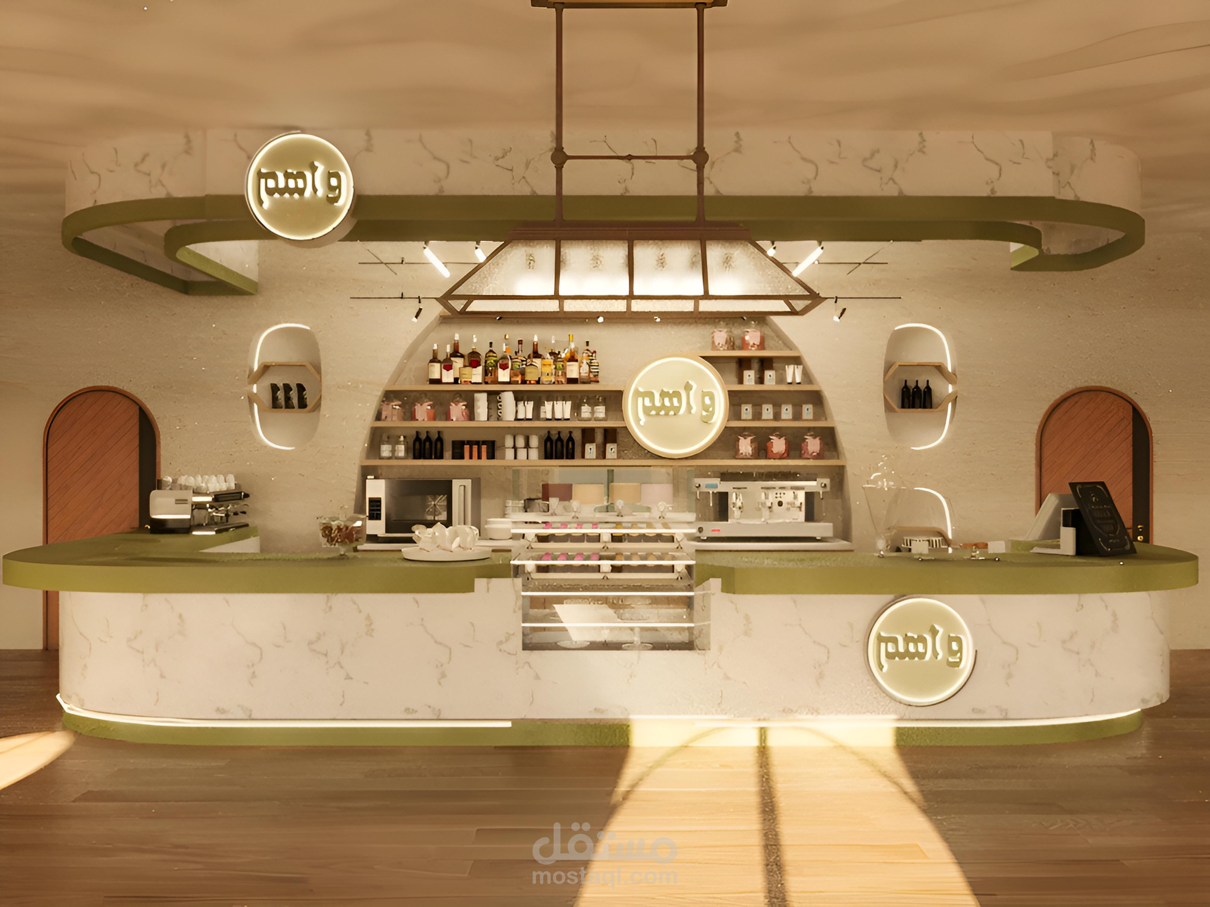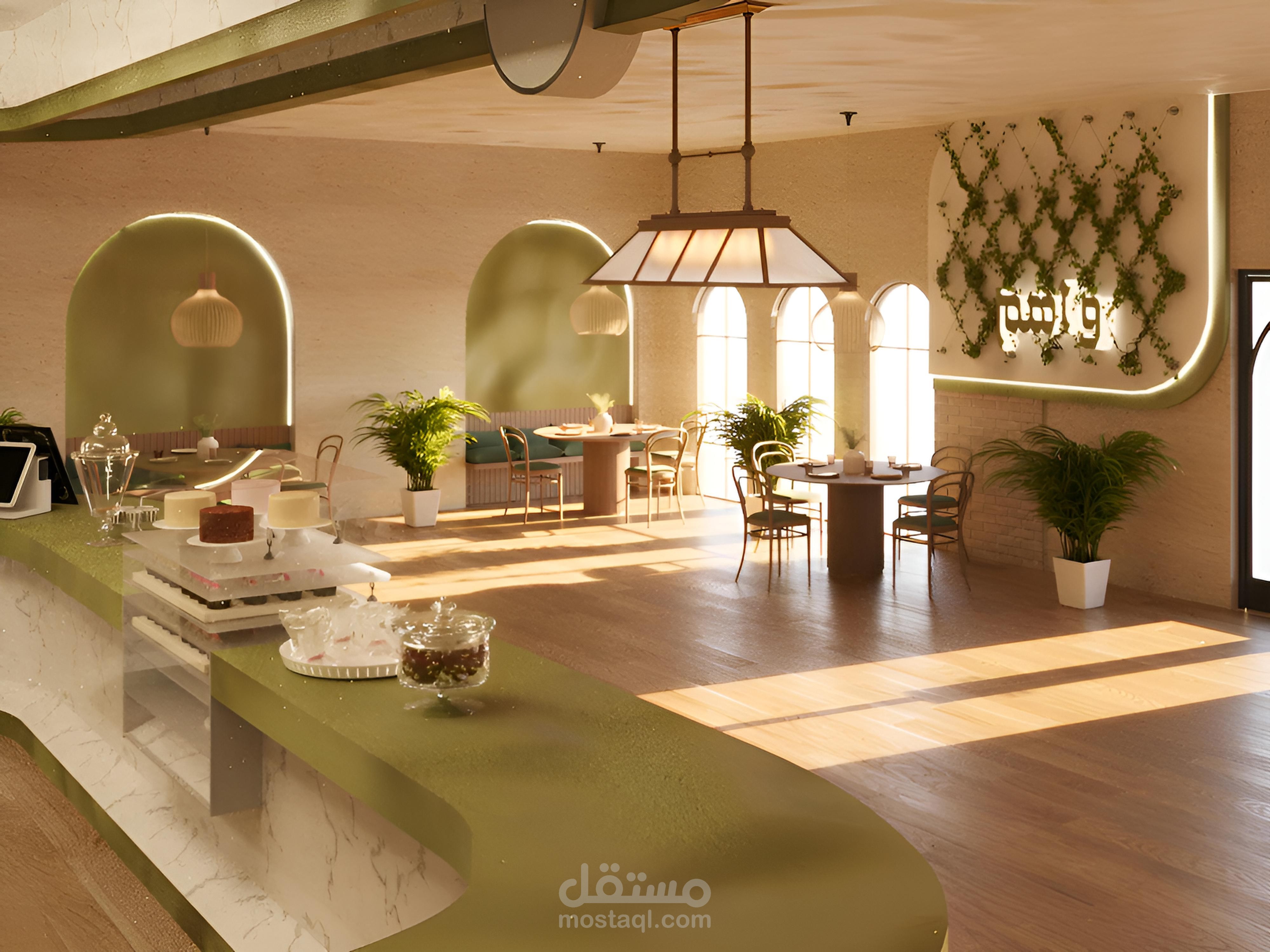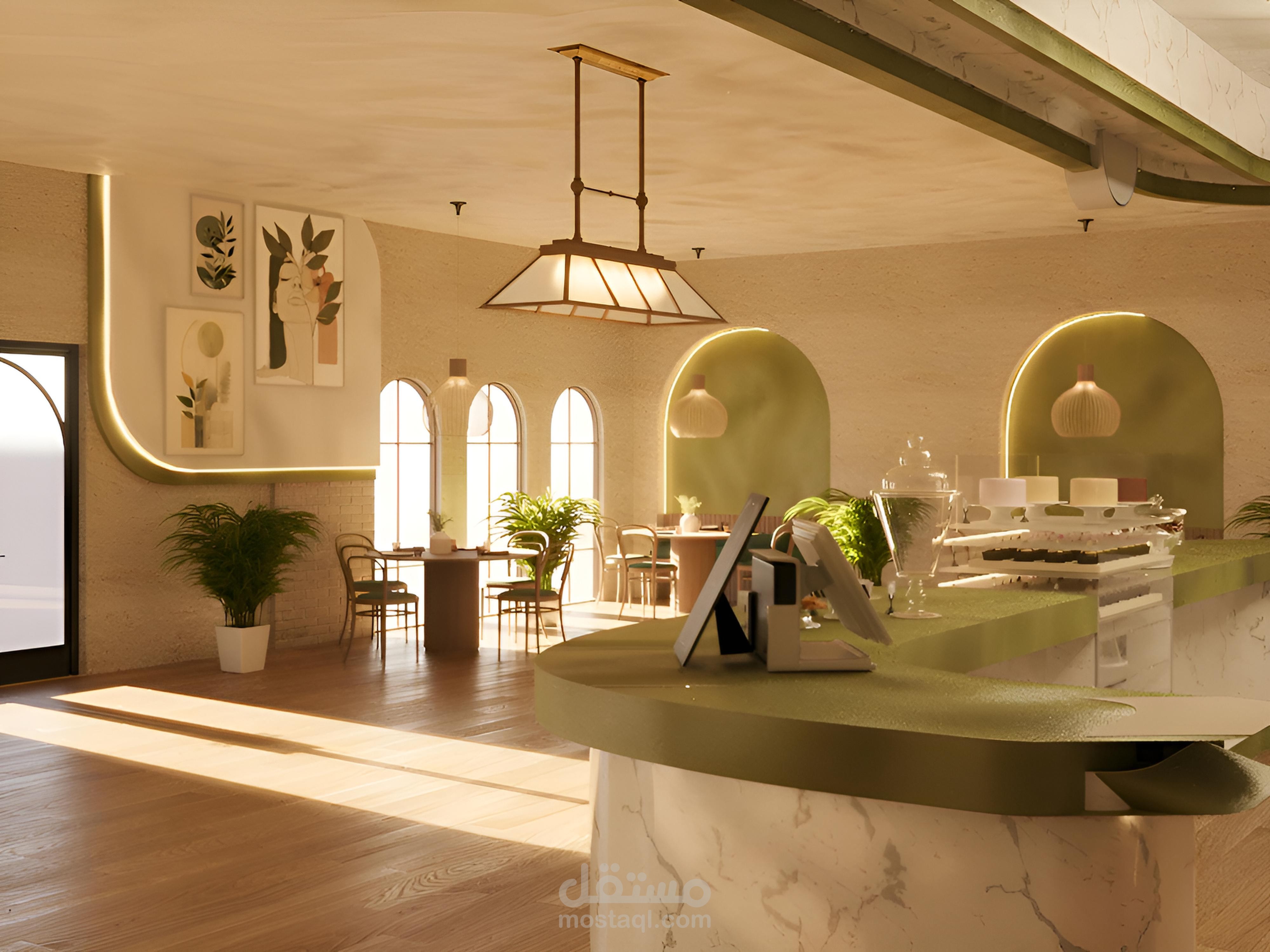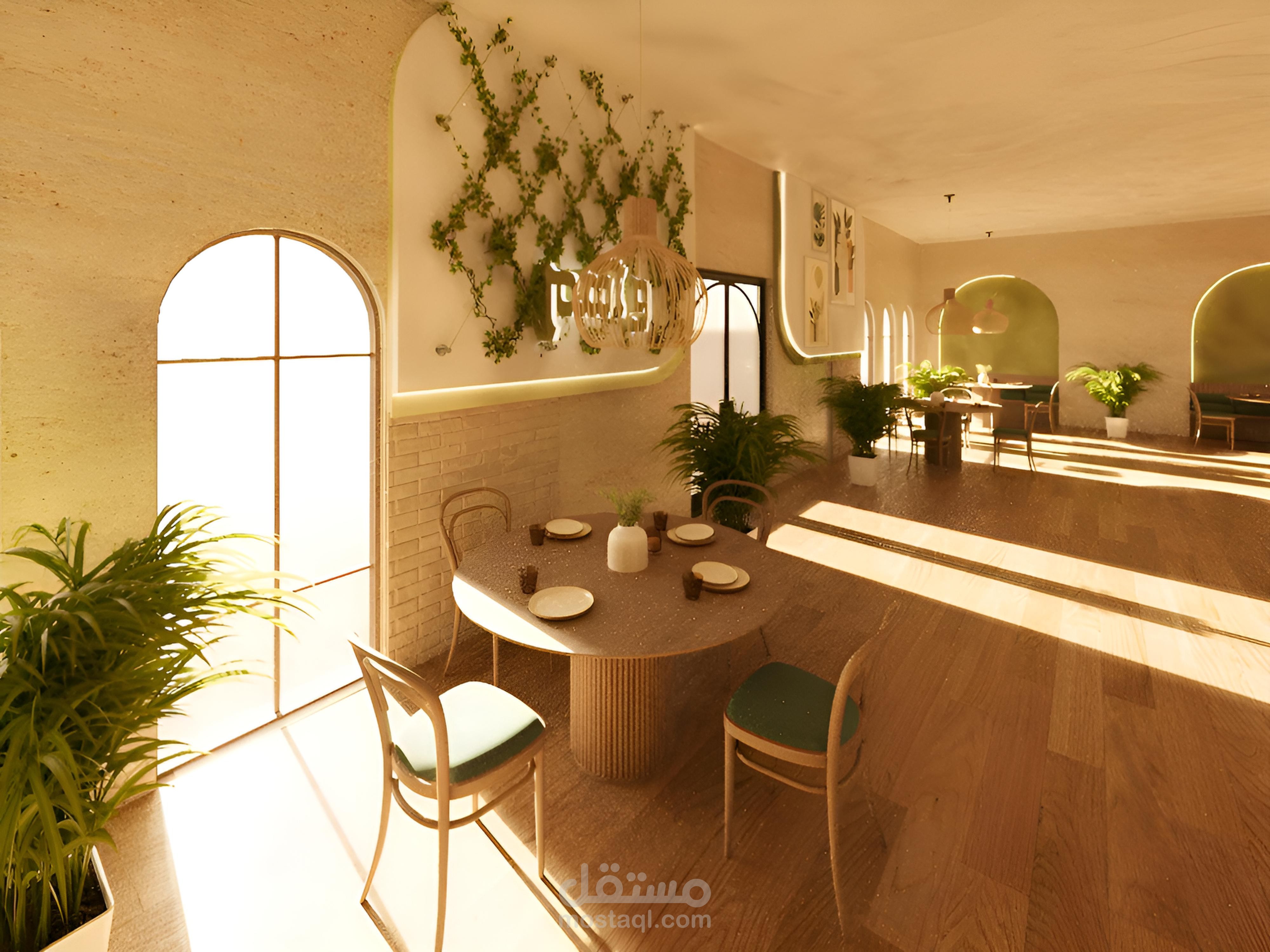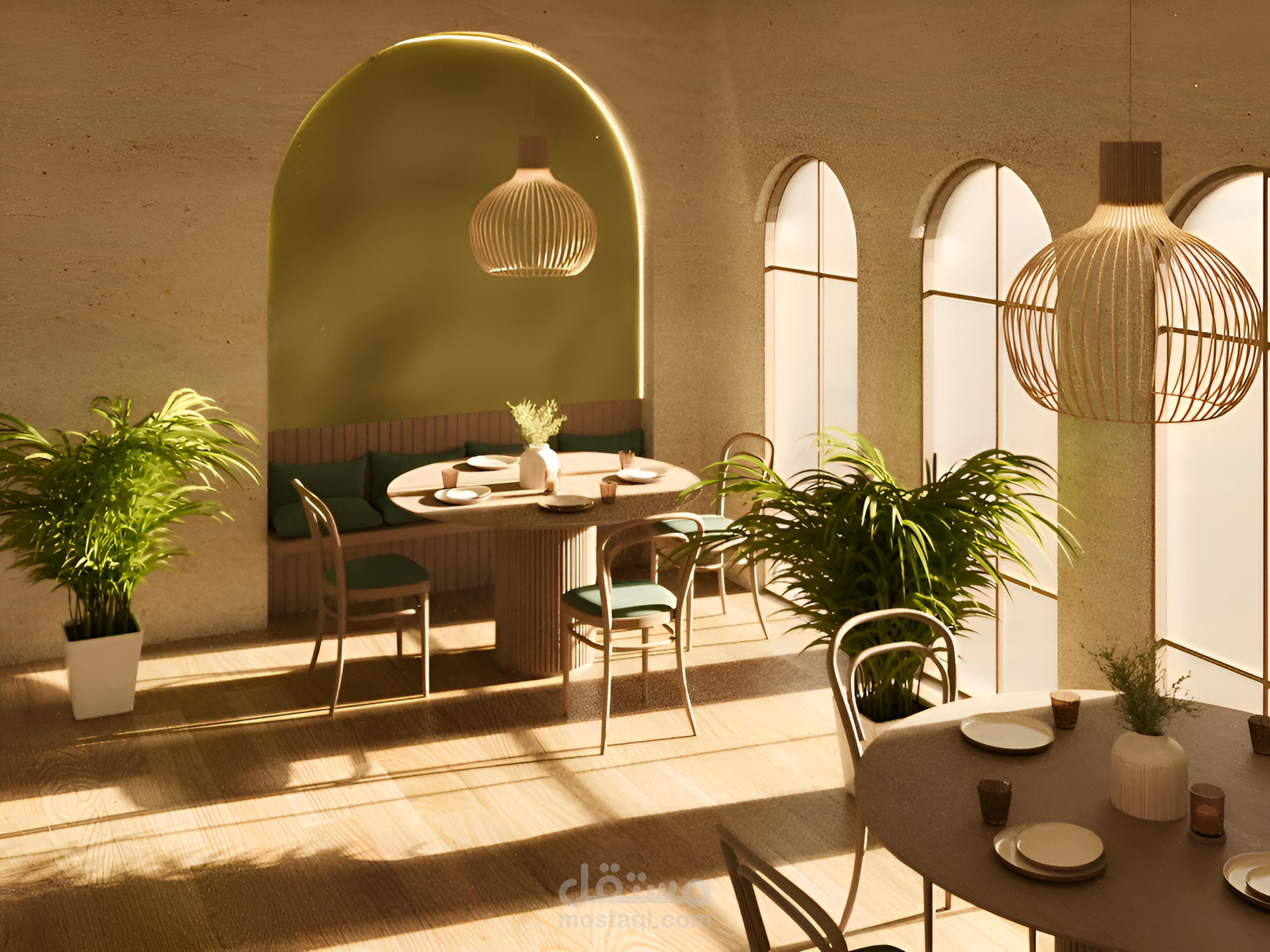 التصميم بيعتمد على ألوان ترابية، إضاءة دافئة، ودمج عناصر طبيعية علشان يخلق جو مميز ومريح.