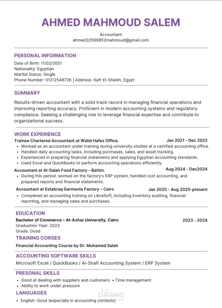 The CV was created using the ATS method on the Canva program, which supports the Word program for editing. It consists of personal information, a summary of his work, practical experience, education, training courses, experience, and skills in the programs related to his work.