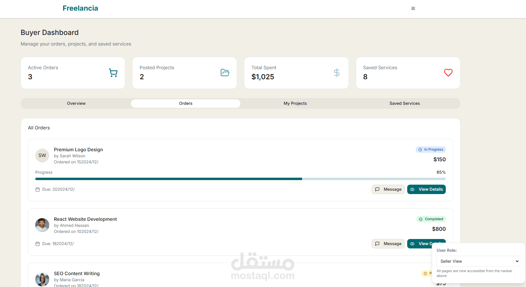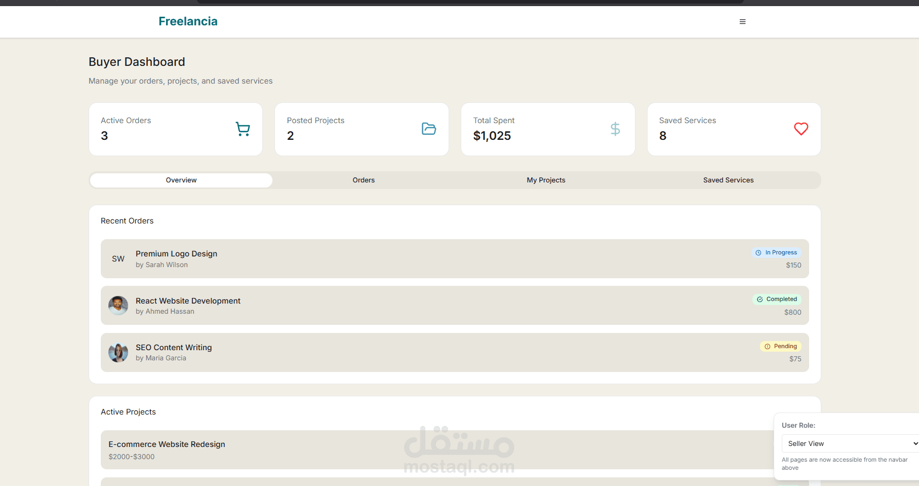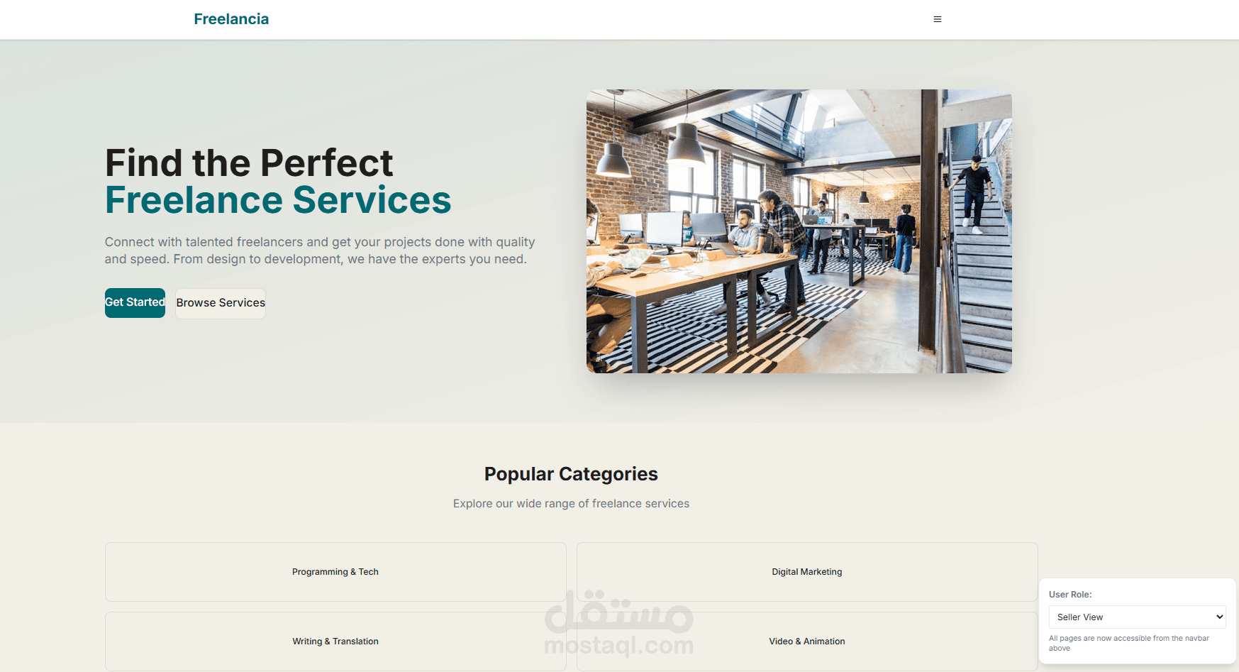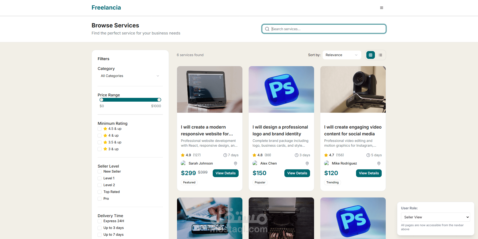 طورت واجهة منصة كاملة تشبه مواقع خمسات و مستقل لربط المستقلين (البائعين) مع العملاء (المشترين)، باستخدام React.js و Tailwind CSS.