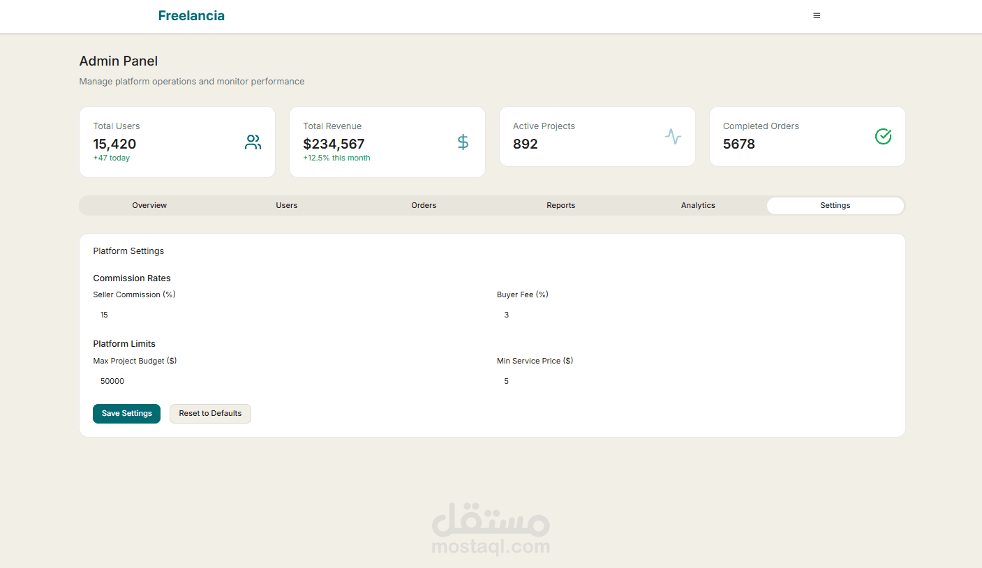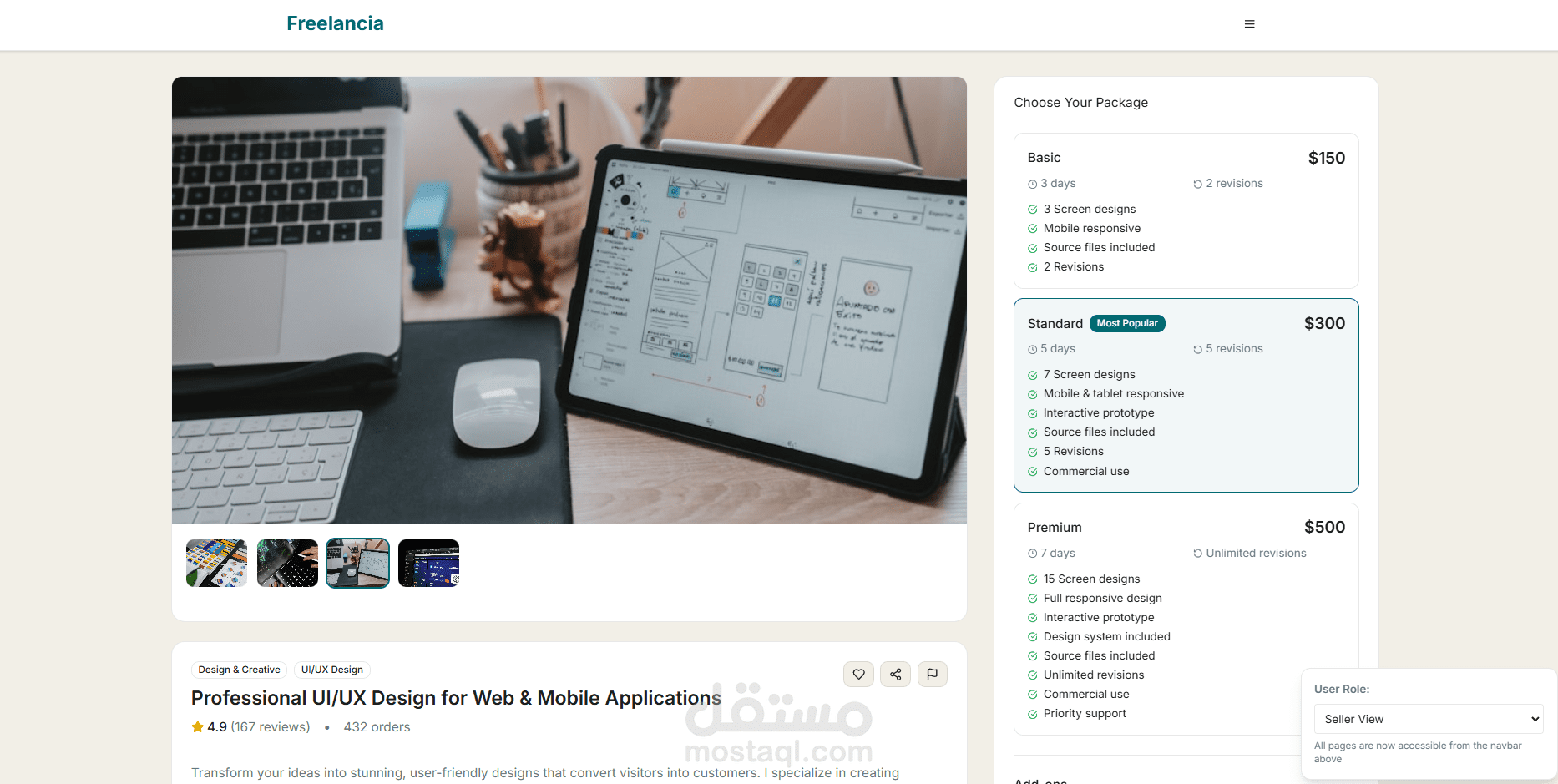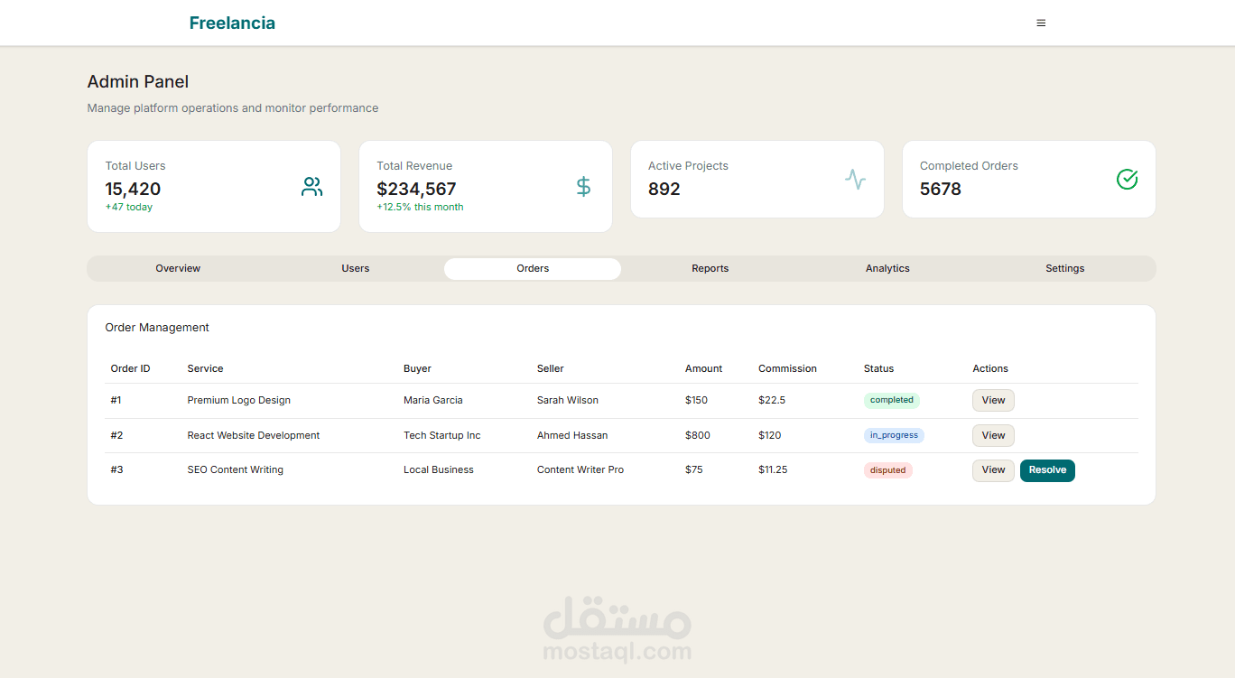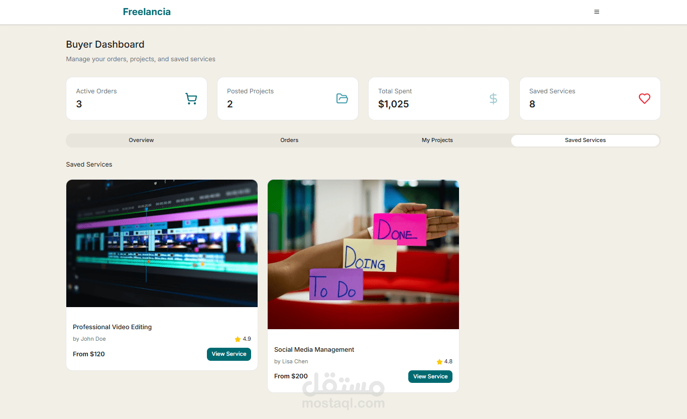 طورت واجهة منصة كاملة تشبه مواقع خمسات و مستقل لربط المستقلين (البائعين) مع العملاء (المشترين)، باستخدام React.js و Tailwind CSS.