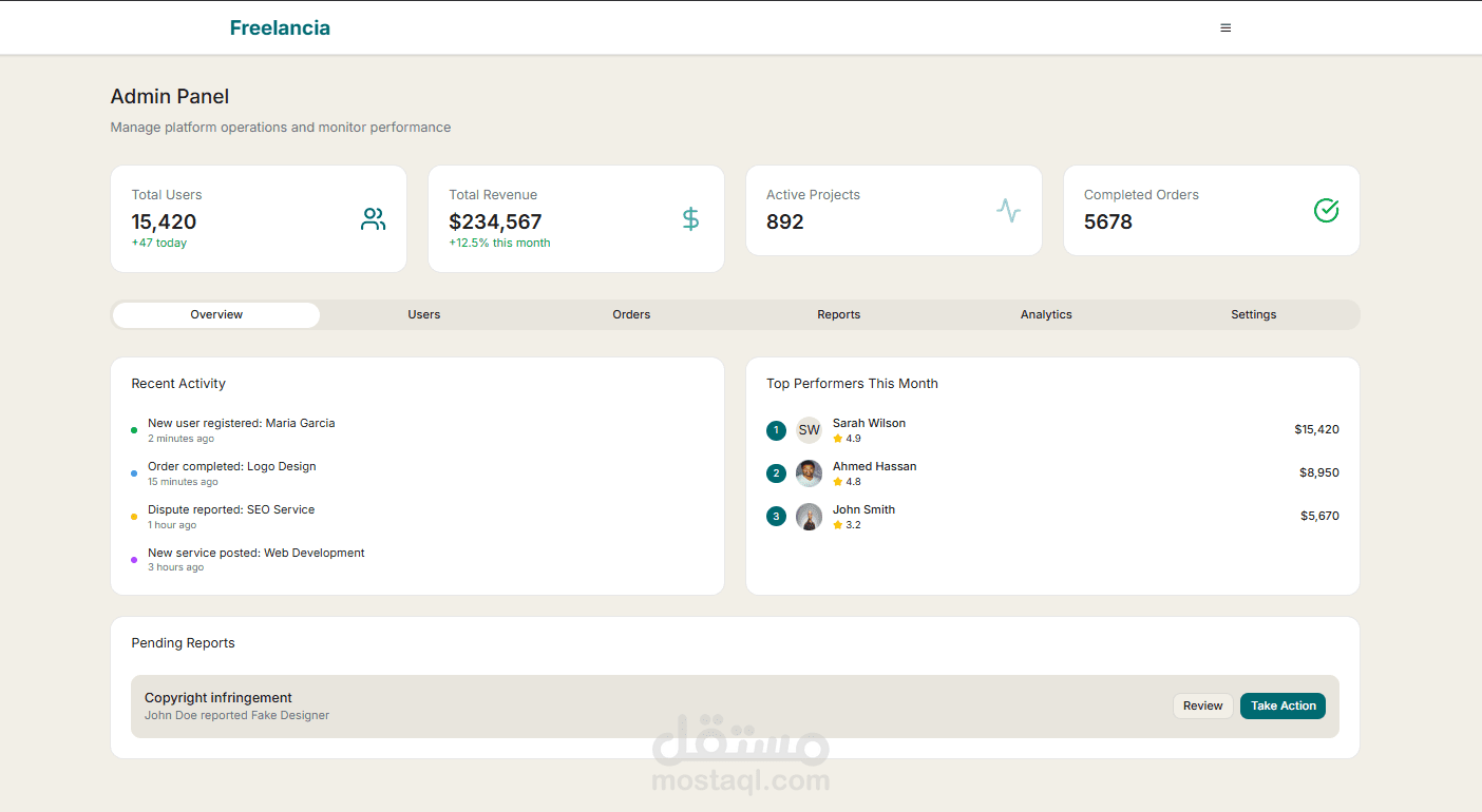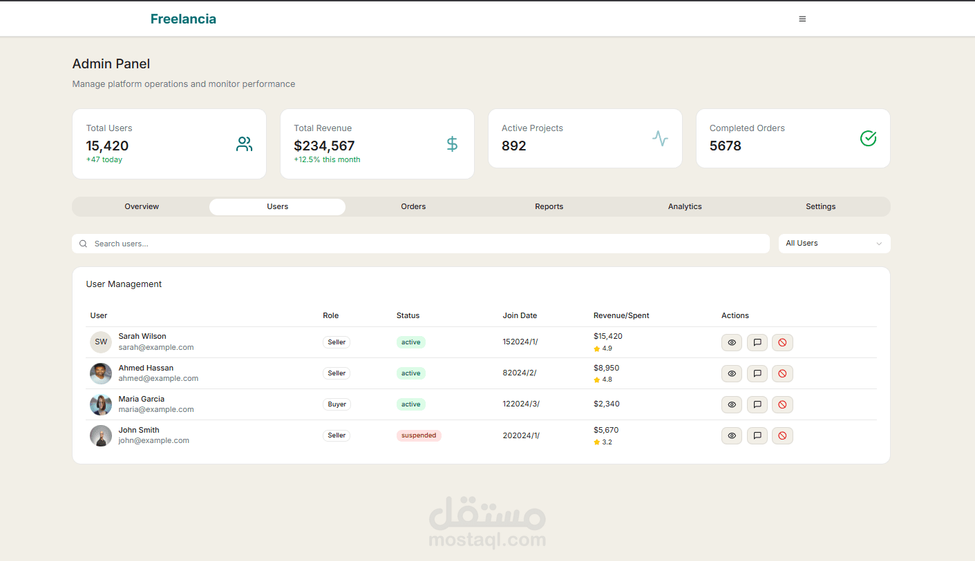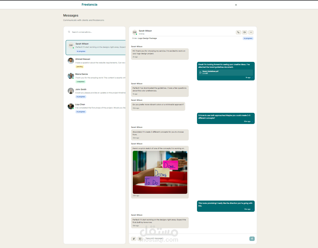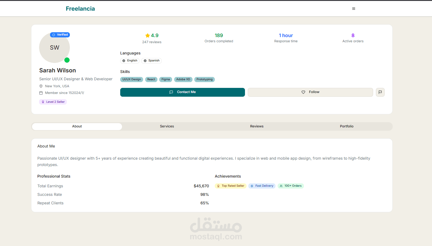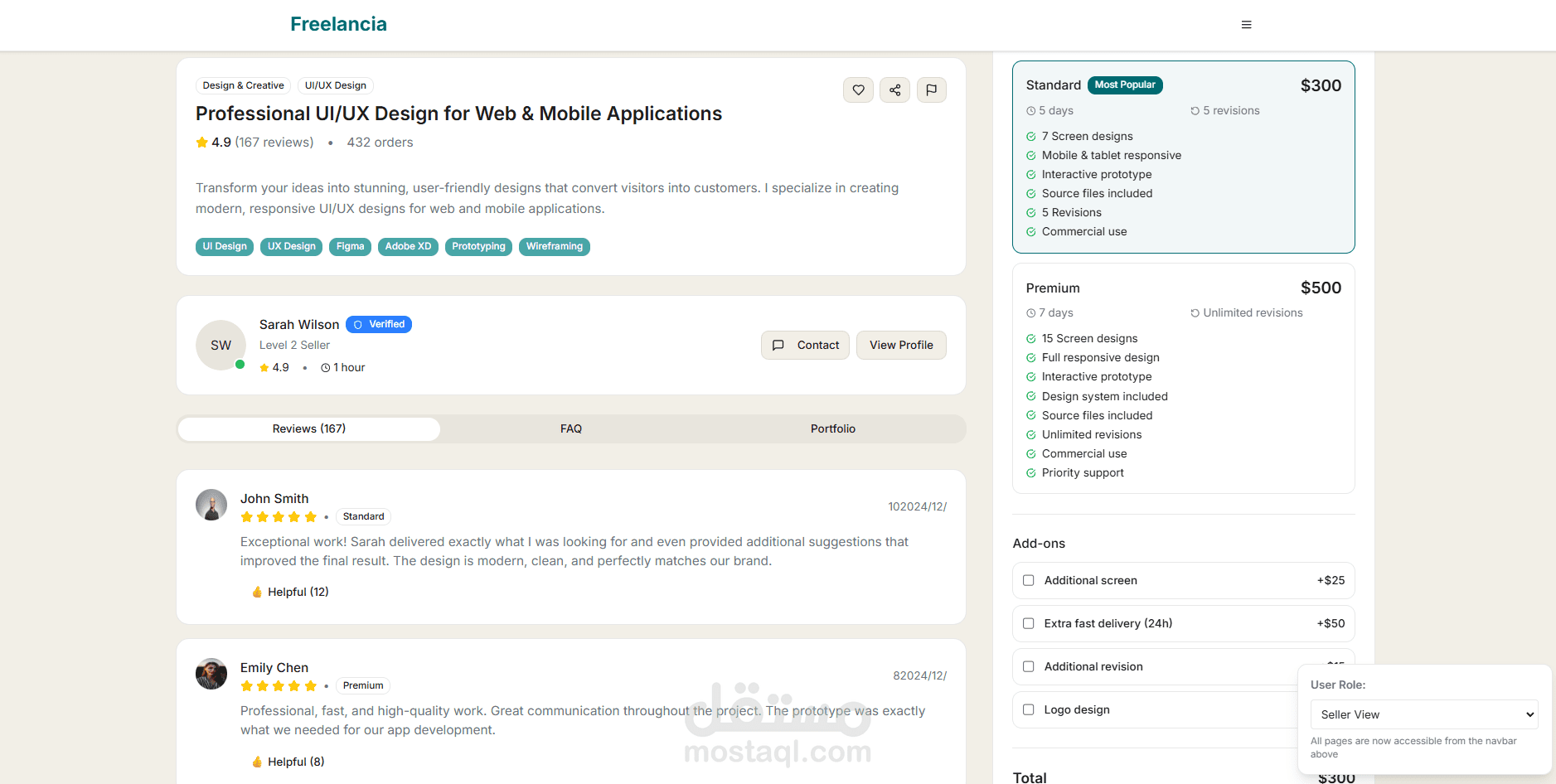 طورت واجهة منصة كاملة تشبه مواقع خمسات و مستقل لربط المستقلين (البائعين) مع العملاء (المشترين)، باستخدام React.js و Tailwind CSS.