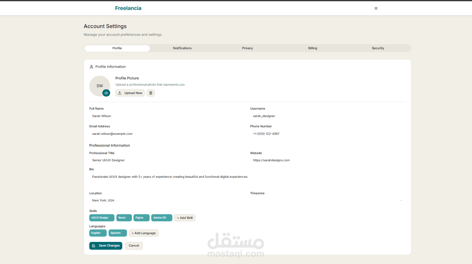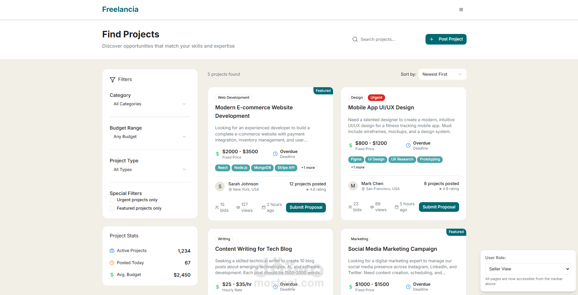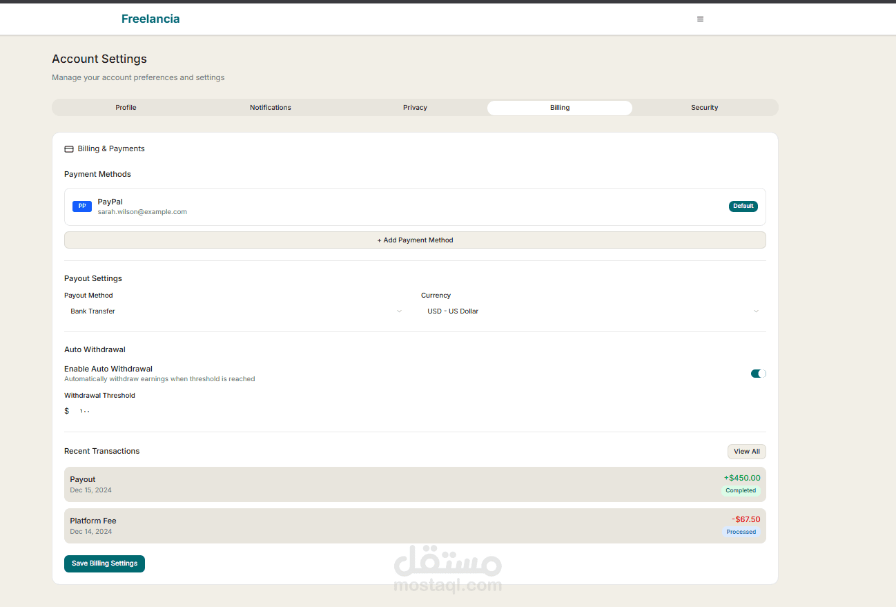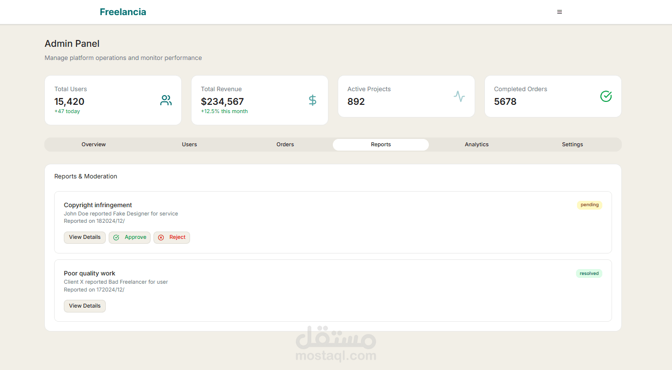طورت واجهة منصة كاملة تشبه مواقع خمسات و مستقل لربط المستقلين (البائعين) مع العملاء (المشترين)، باستخدام React.js و Tailwind CSS.