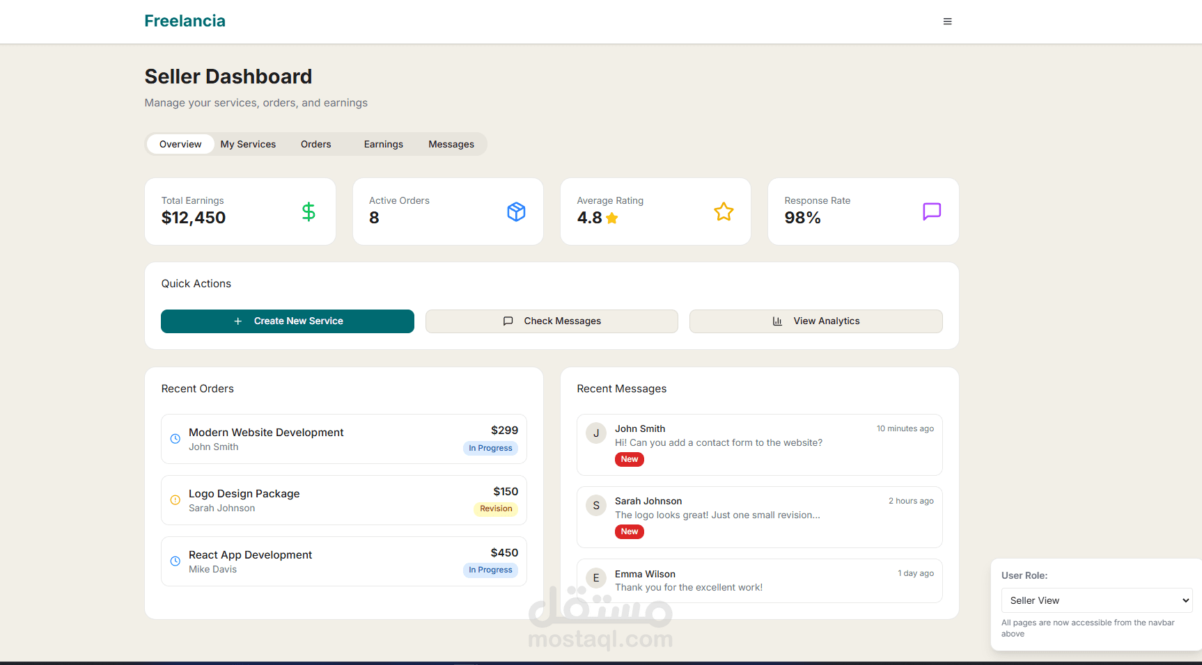 لوحة تحكم للبائع لإدارة الخدمات، الطلبات، الأرباح، والرسائل.