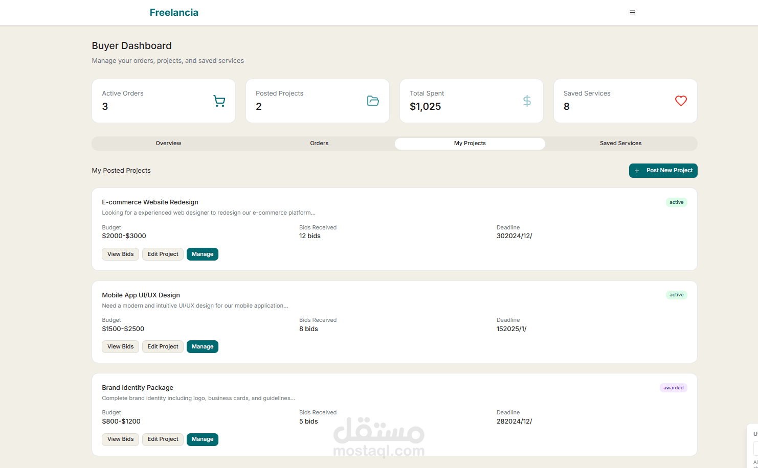 مشاريع (Projects) مع إمكانية نشر المشاريع واستقبال العروض.
