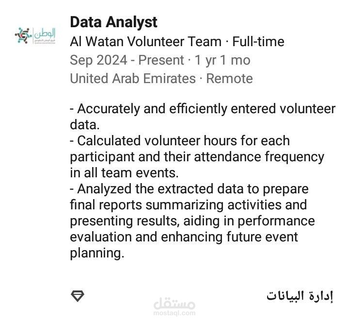 عملت كـ Data Analyst ضمن فريق التطوع في الوطن، حيث قمت بـ: