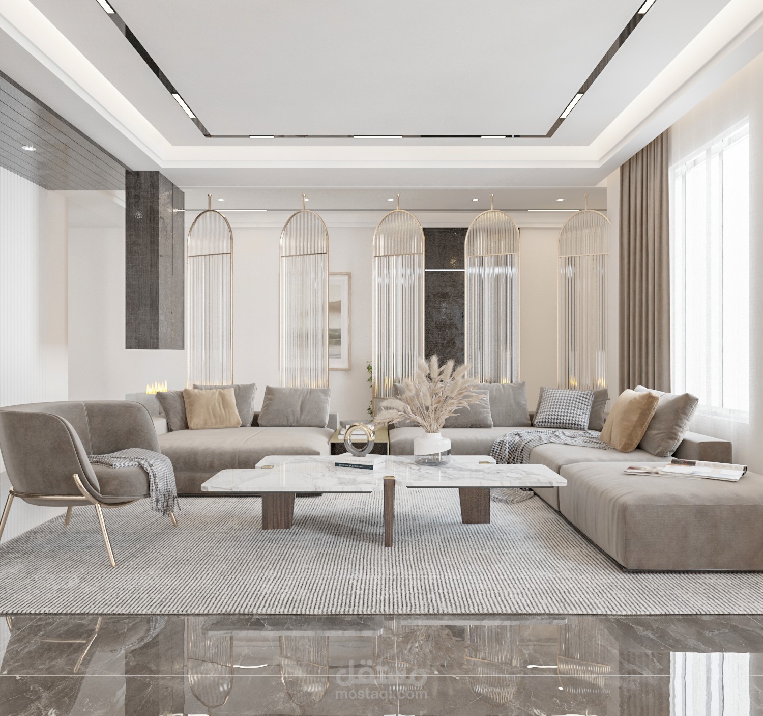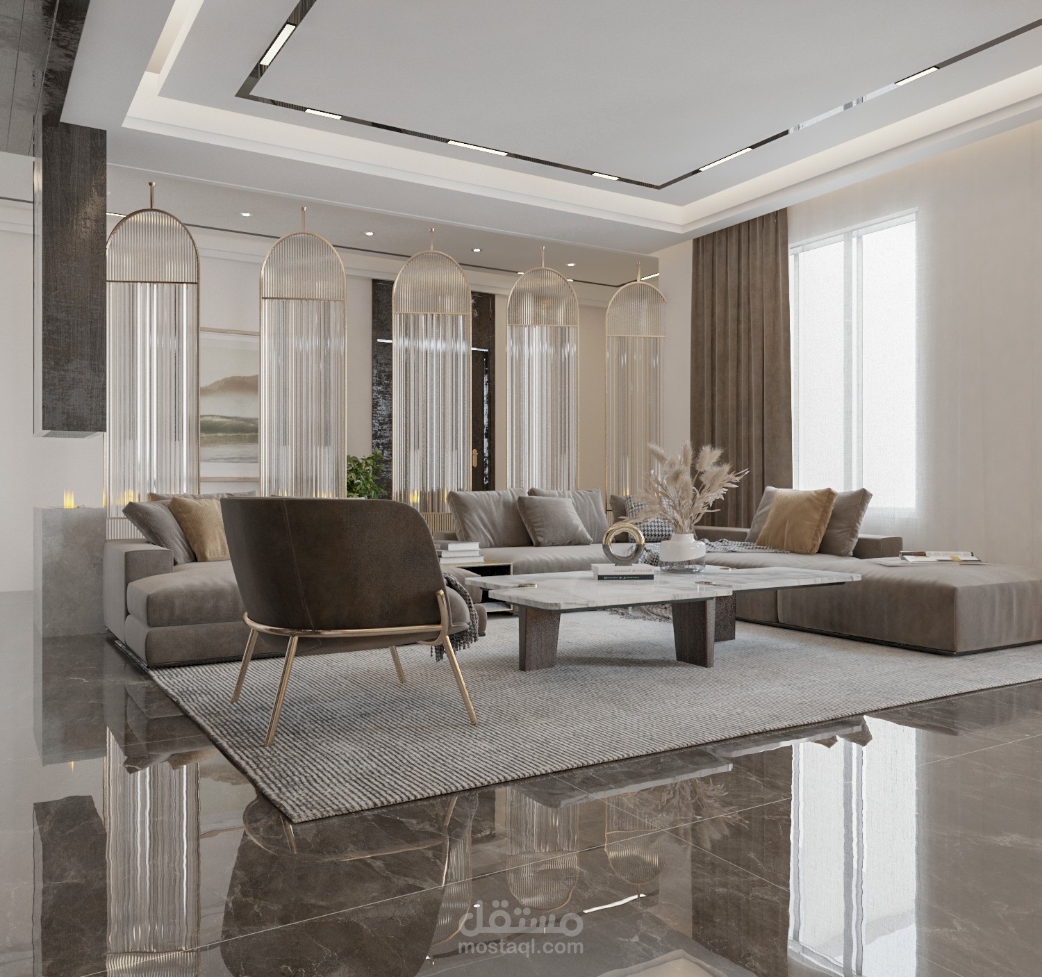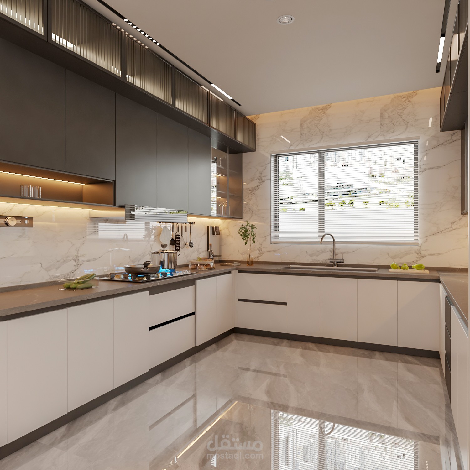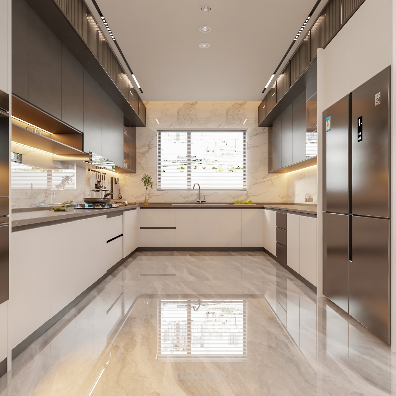 تصميم منطقة معيشة و مطبخ مفتوح بمدينة جدة على الطراز الحديث