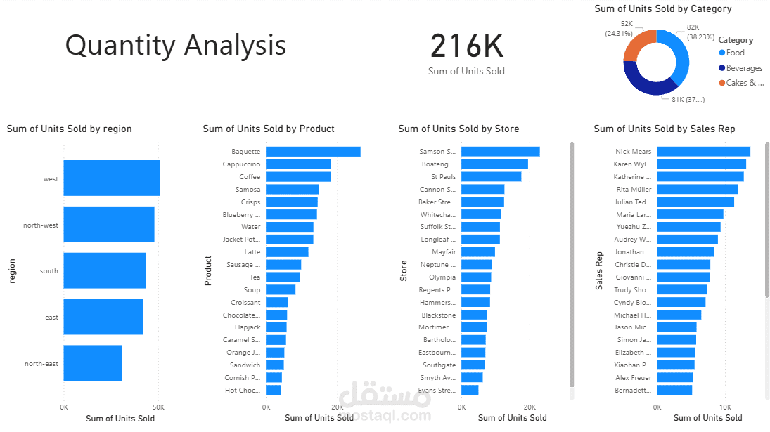 "قمت بإعداد تحليل بيانات تفاعلي باستخدام Power BI لعرض كمية المبيعات حسب المنطقة، المنتج، الفئة، الفرع، ومندوب المبيعات. التقرير ساعد في إبراز أعلى المنتجات والمناطق مبيعًا، مع توضيح إجمالي الوحدات المباعة (216K). تم جمع البيانات، تنظيفها وتحليلها باستخدام Power Query، ثم تصميم لوحة معلومات سهلة الفهم لدعم اتخاذ القرار."