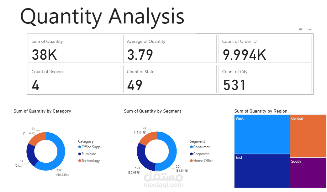 "قمت بإعداد تحليل بيانات تفاعلي باستخدام Power BI لعرض كمية المبيعات حسب المنطقة، المنتج، الفئة، الفرع، ومندوب المبيعات. التقرير ساعد في إبراز أعلى المنتجات والمناطق مبيعًا، مع توضيح إجمالي الوحدات المباعة (216K). تم جمع البيانات، تنظيفها وتحليلها باستخدام Power Query، ثم تصميم لوحة معلومات سهلة الفهم لدعم اتخاذ القرار."