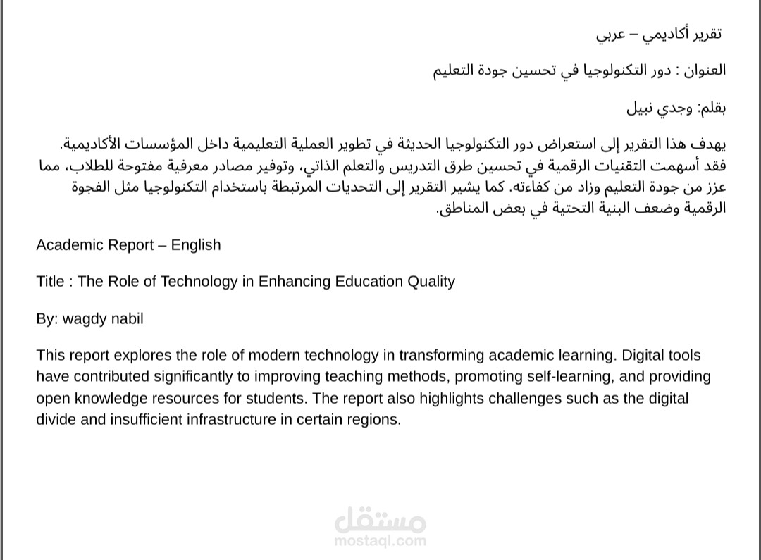 كتابة تقارير بحثية وأكاديمية باللغة العربية والإنجليزية، وكذلك المساعدة في إعداد وصياغة كتب ومحتويات تعليمية بأسلوب مبسط ومنظم.