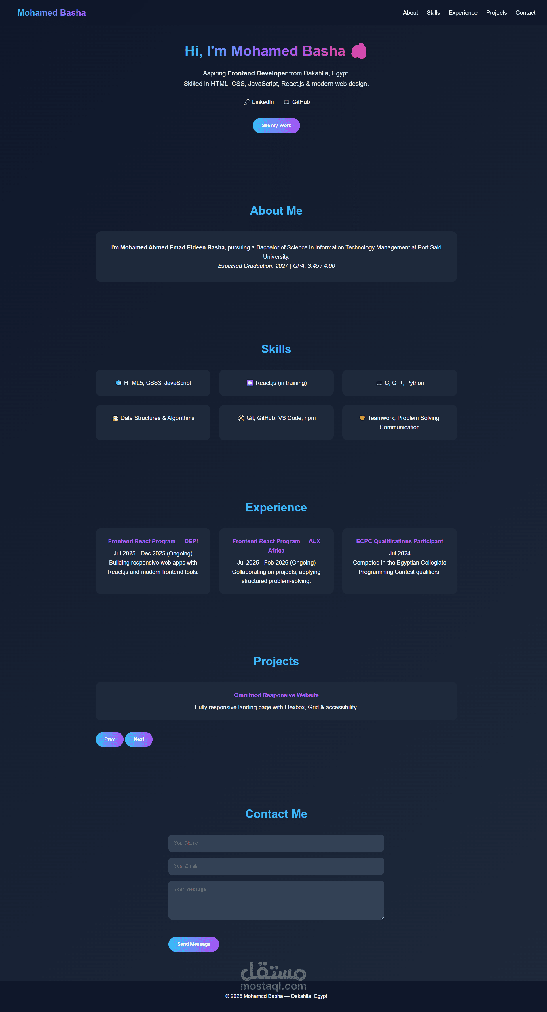 الموقع بيعرض مهاراتي، مشاريعي، وطرق التواصل معي بشكل منظم، عصري، ومتجاوب مع جميع الأجهزة.