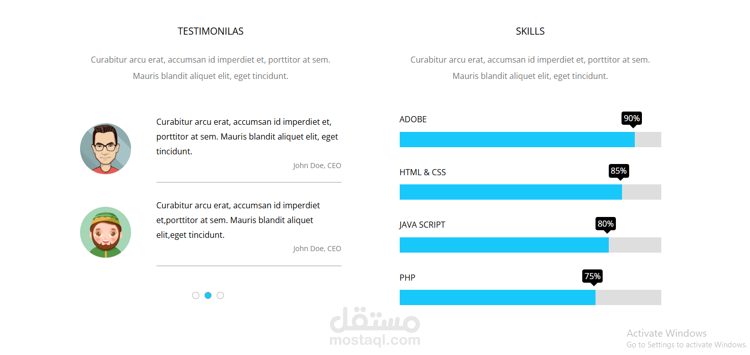 "A modern landing page contains: a navbar, hero section, pricing, skills, testimonials, videos, services, contact us, about us, and a footer."