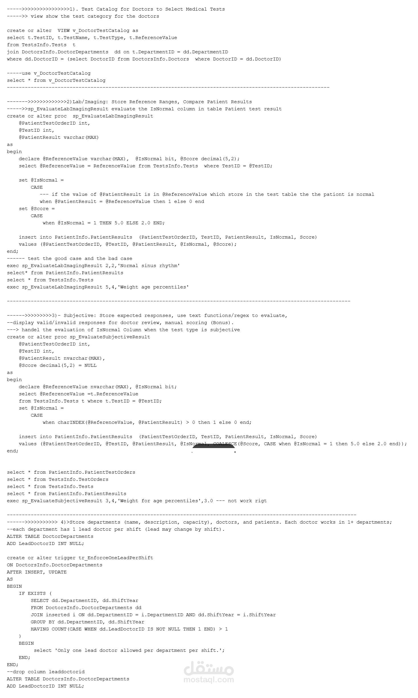الاستعلامات (Queries) + النتائج + التعليقات (Test DDL, Procedures, Error Handling, Transactions, Cursors).