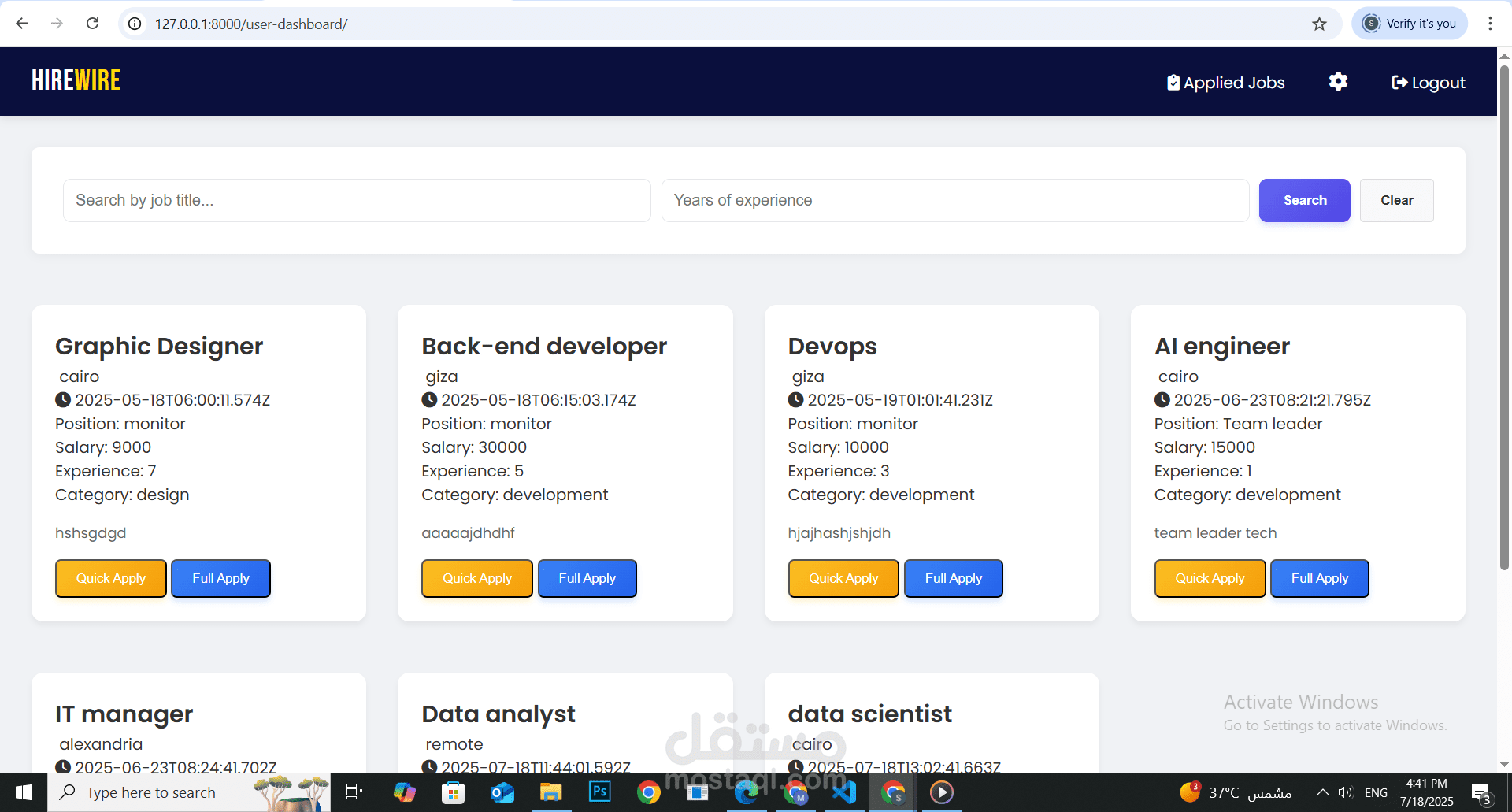 HireWire هي منصة حديثة وديناميكية للبحث عن الوظائف، تم تطويرها كمشروع كامل لتقنيات الويب. مبنية بأسلوب Full Stack بحيث تقدم تجربة غنية لكلٍ من الباحثين عن عمل وأصحاب الشركات، مع التركيز على سهولة الاستخدام، الأمان، والاستجابة السريعة.