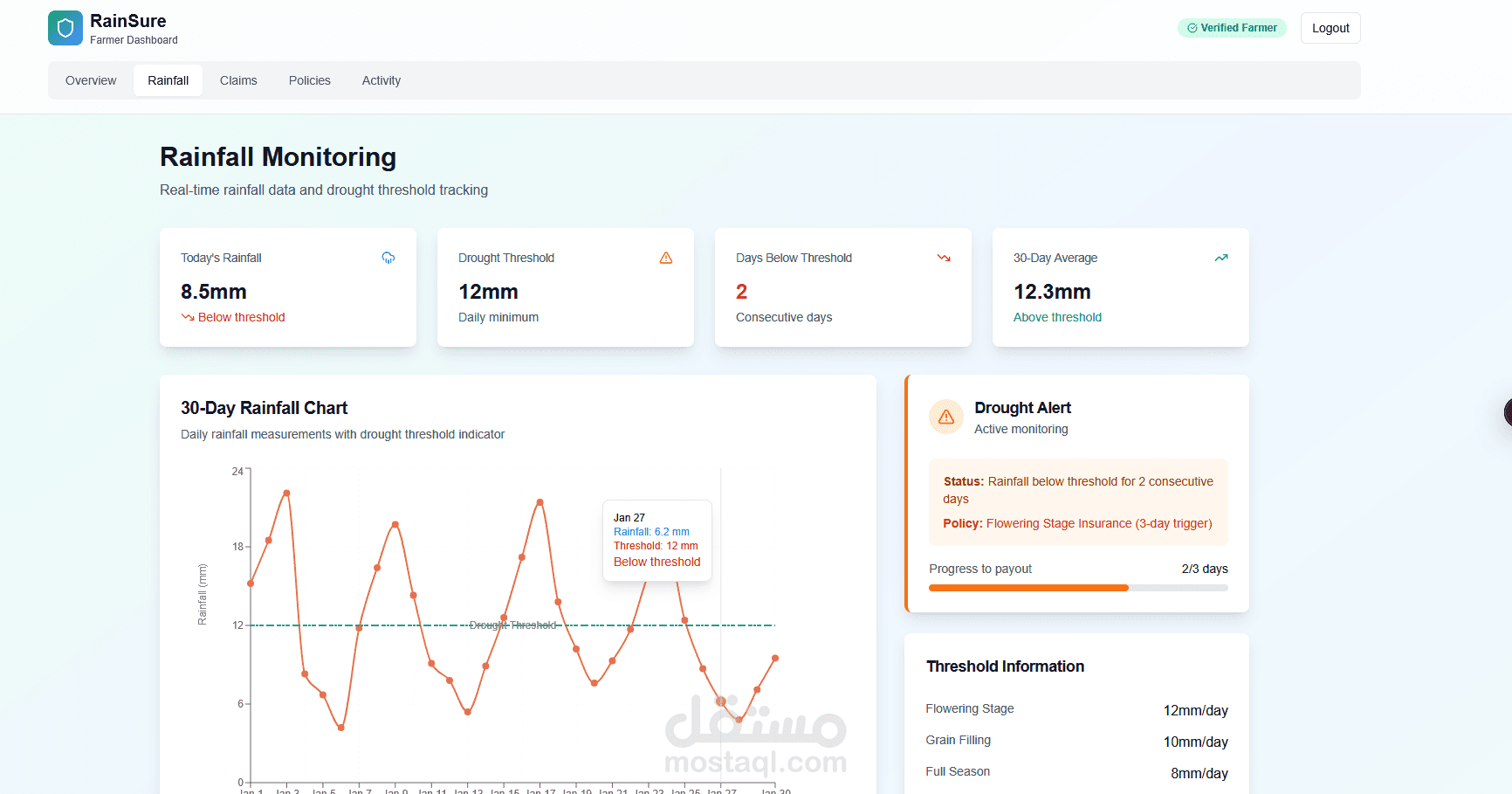 If rainfall is below the drought threshold, the contract triggers a payout — instantly and without bias.