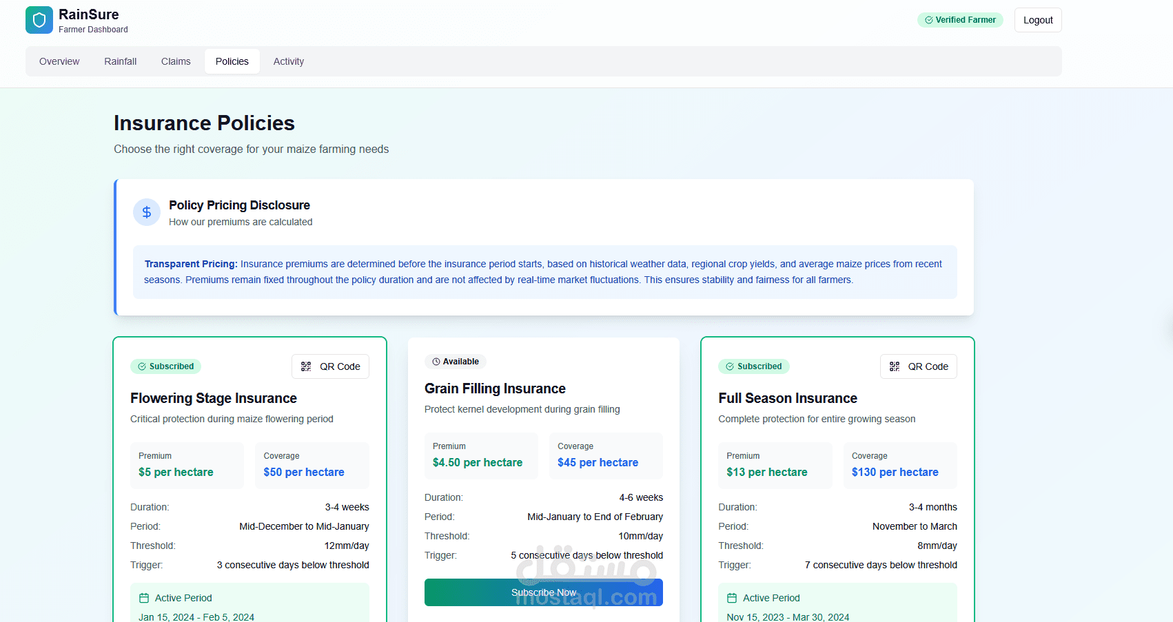Each option covers a specific period in the maize crop cycle that is most vulnerable to drought. Instead of waiting for losses, the platform monitors rainfall data in real-time and triggers payouts automatically if conditions are met.