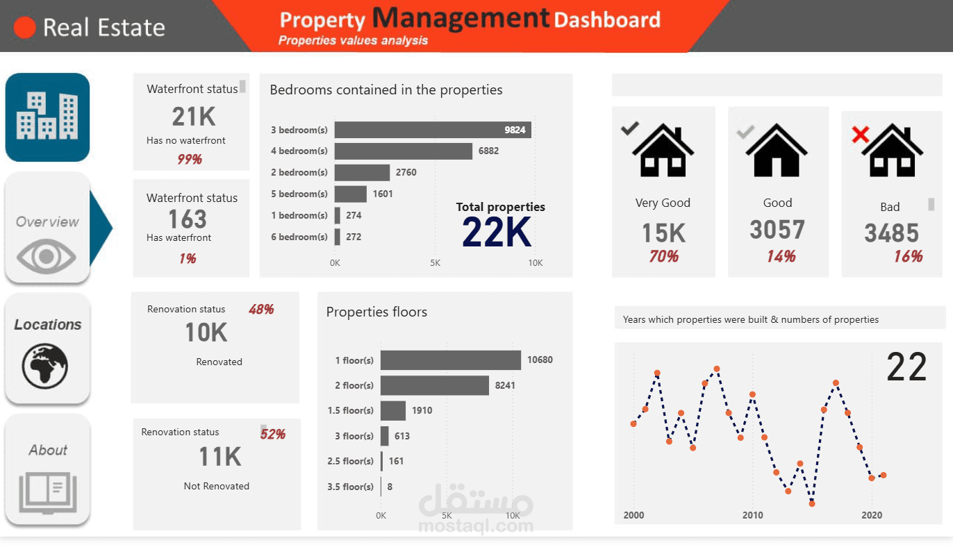 Power BI: Designed a dashboard that provides a full overview of property status and conditions.
