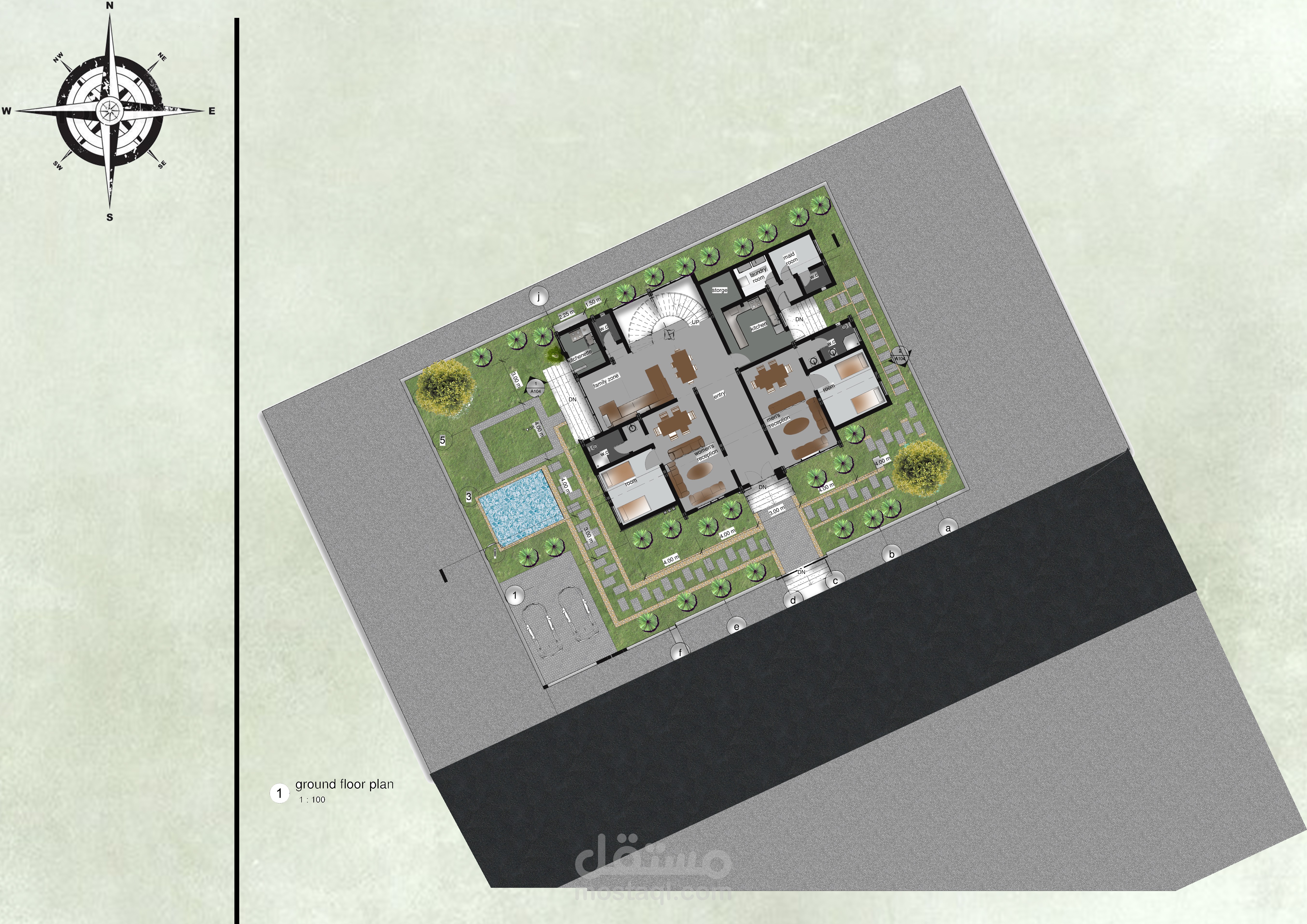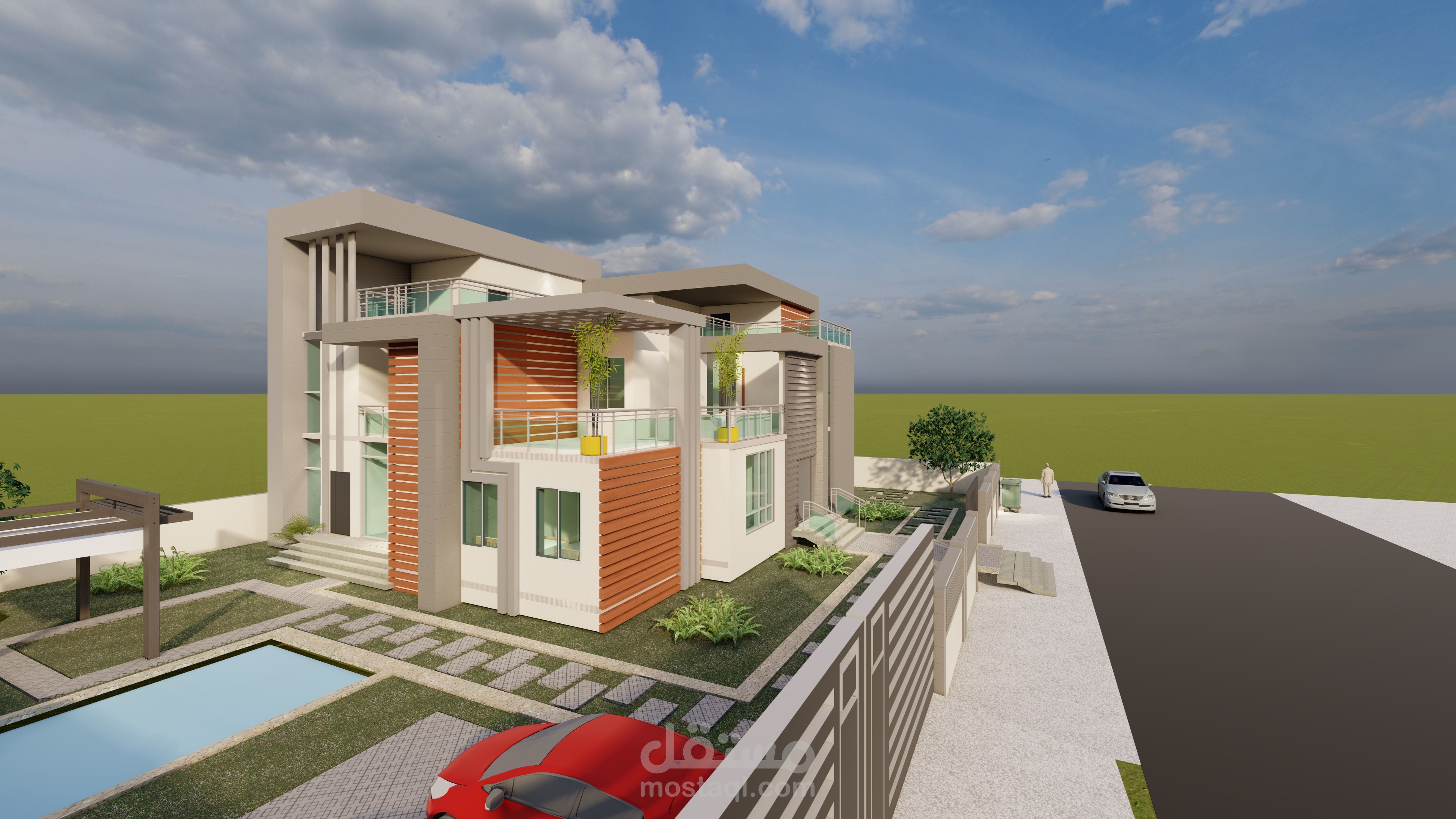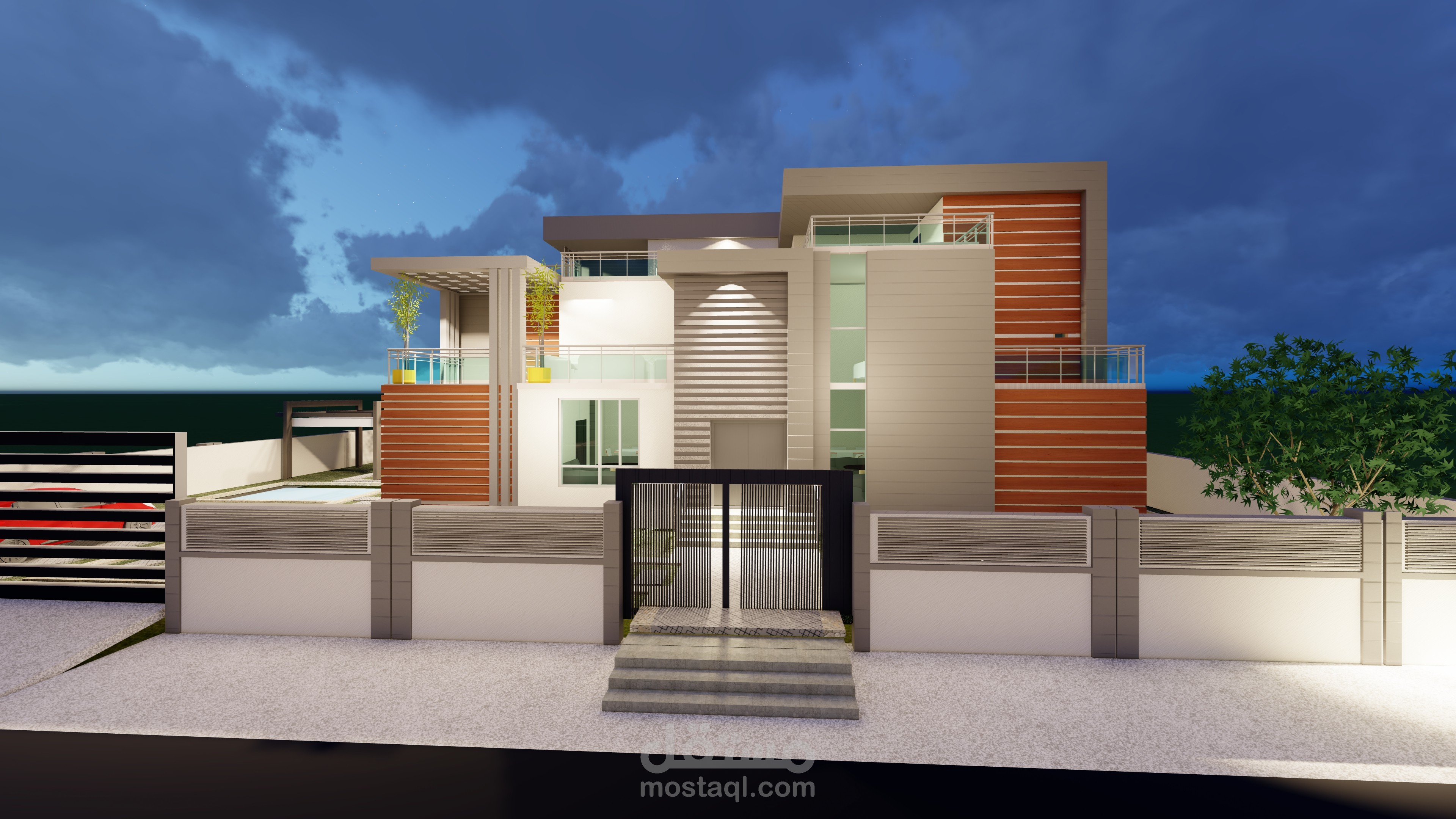 تصميم فيلا من ثلاث طوابق بمساحه 600م مربع باستخدام ريفيت واظهار بلومين وفوتوشوب الطابف الارضي يحتوي على الاستقبال والمطبخ والفراغات الخدميه الطابق الاول يحتوي على غرف النوم والثالث على الفراغات الترفيهيه