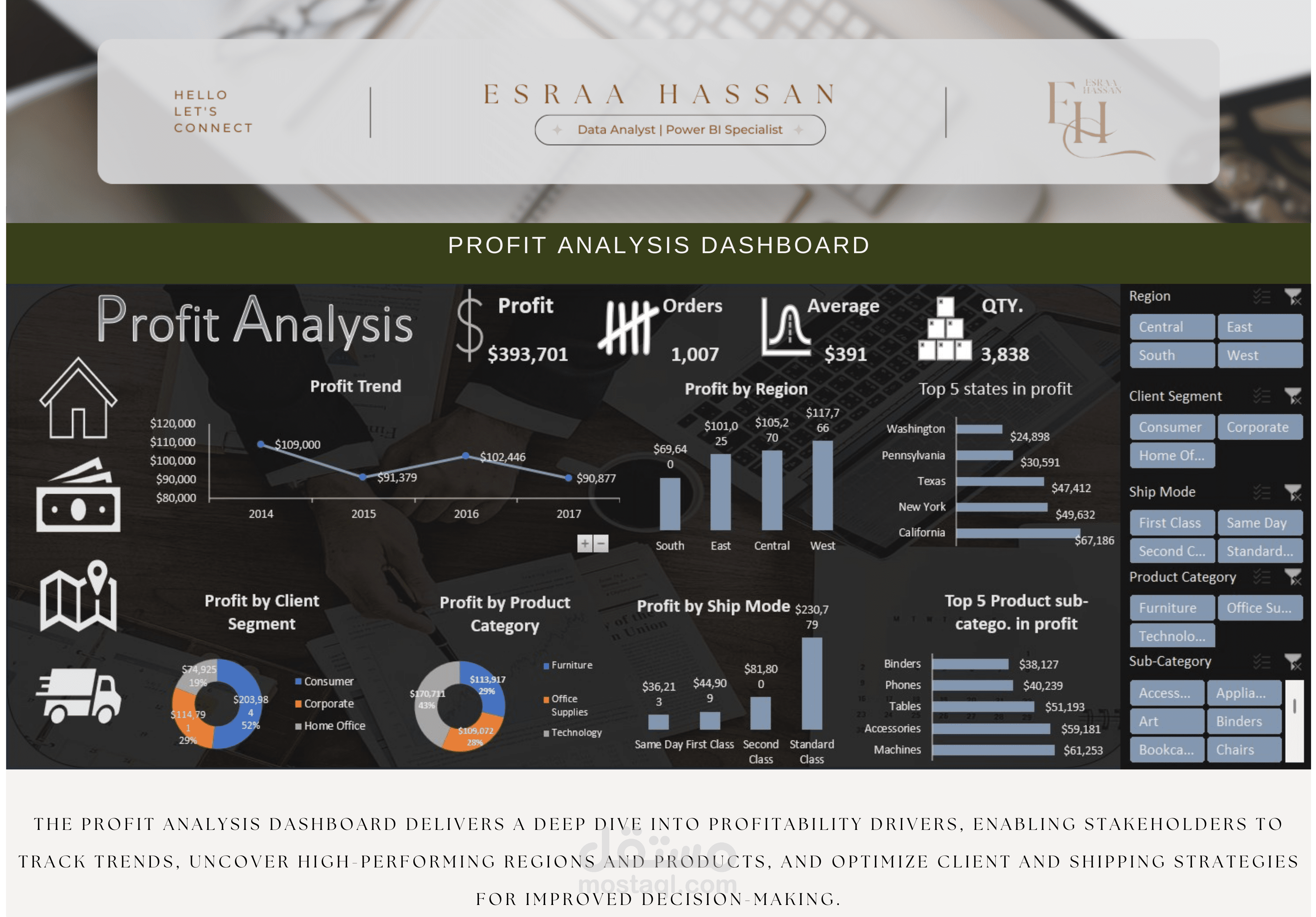 The Profit Analysis Dashboard delivers a deep dive into profitability drivers, enabling stakeholders to track trends, uncover high-performing regions and products, and optimize client and shipping strategies for improved decision-making.