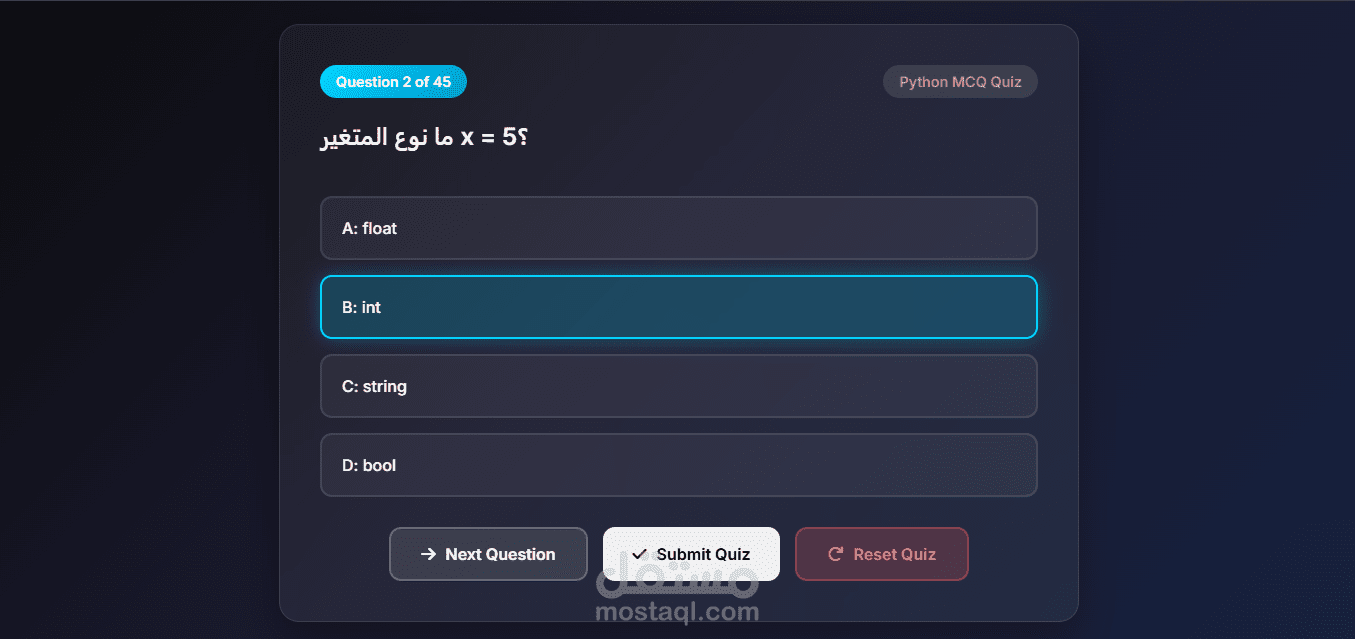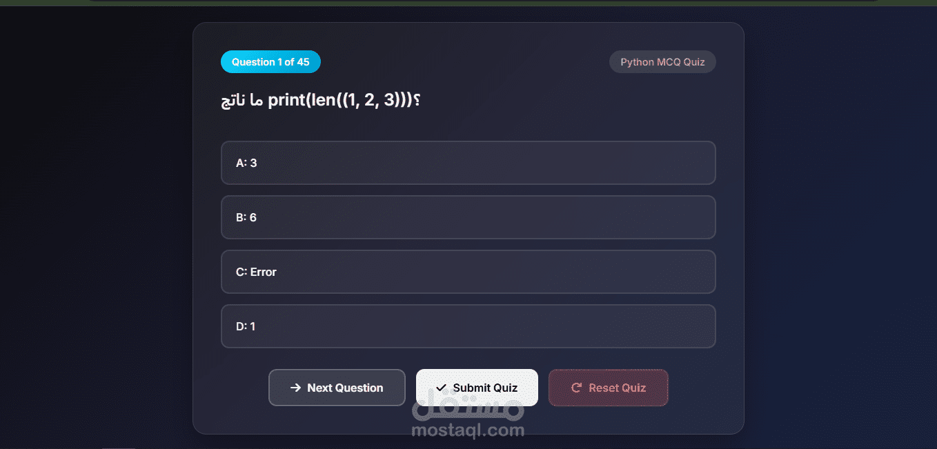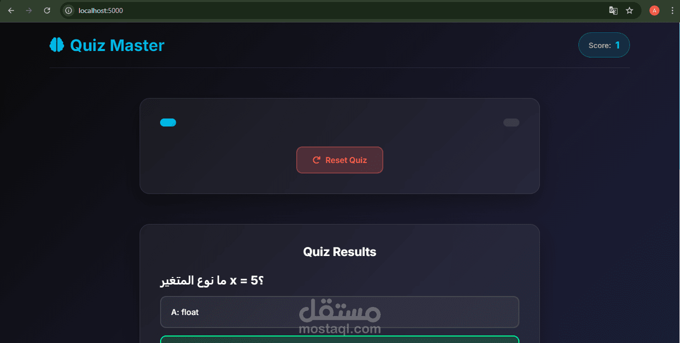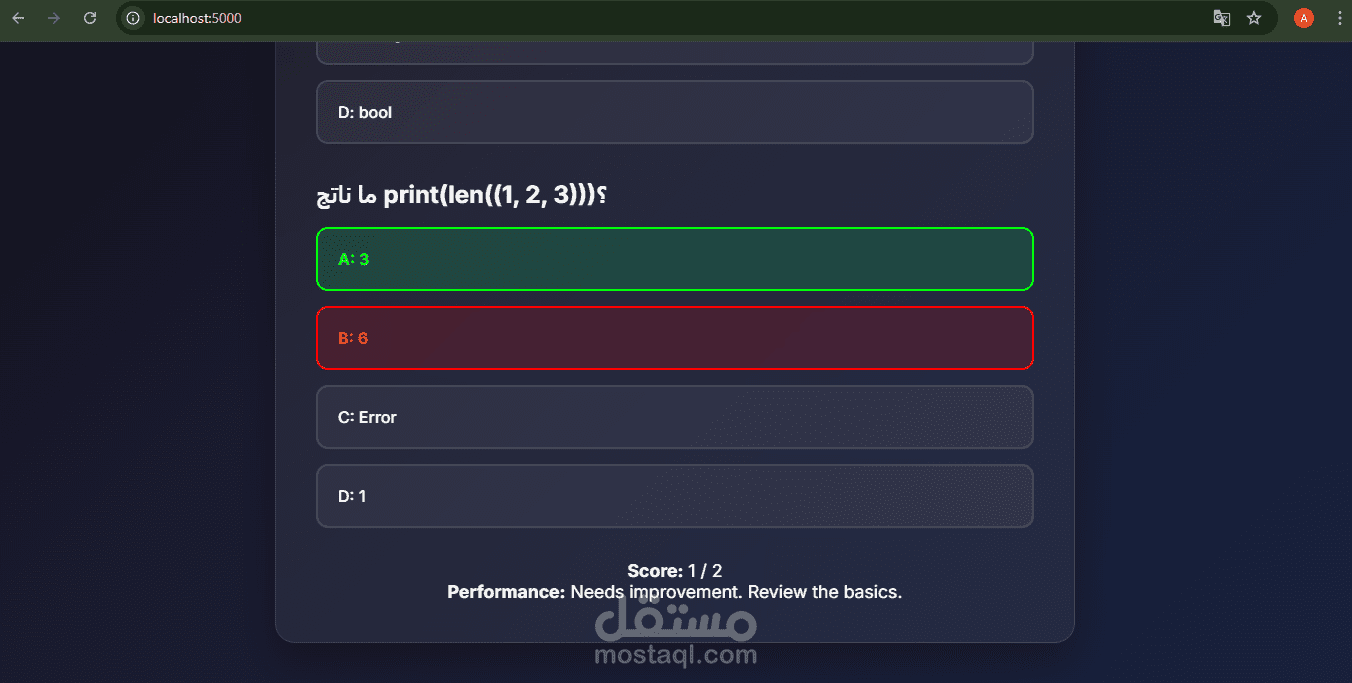 I developed a full web application using Python and Flask framework that provides a multiple choice quiz in Python programming the app starts with a home page to begin the quiz then a page to display the questions with three options to move to the next question submit the quiz or restart it and finally a results page that shows the correct and wrong answers with the total score the questions order changes randomly each time the quiz is started