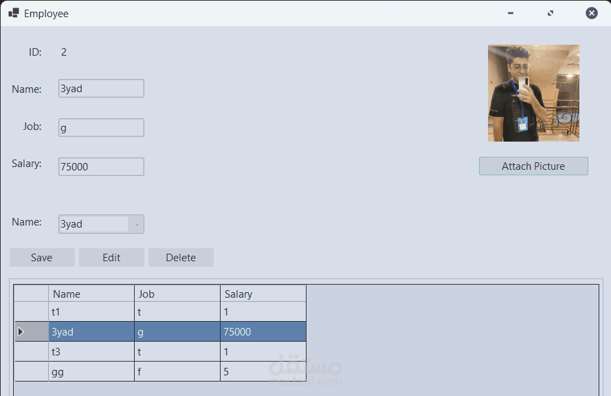 طورت تطبيق مكتبي لإدارة الموظفين يتيح إضافة، تعديل، وحذف بيانات الموظفين بسهولة. التطبيق يحتوي على واجهة رسومية بسيطة تُظهر رقم التعريف، الاسم، الوظيفة، والراتب مع إمكانية إرفاق صورة شخصية. كما يعرض جدول منظم (DataGrid) لجميع الموظفين المسجلين لتسهيل التصفح والإدارة.