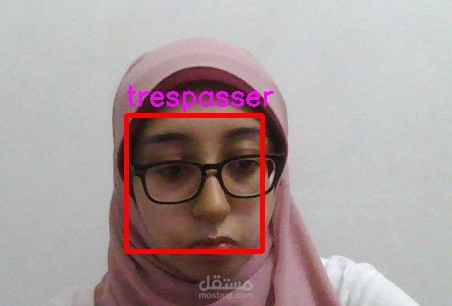 Unknown faces → red rectangle + “Trespasser” alert.