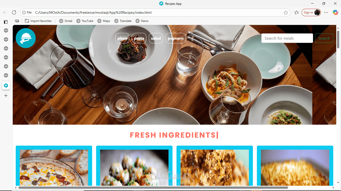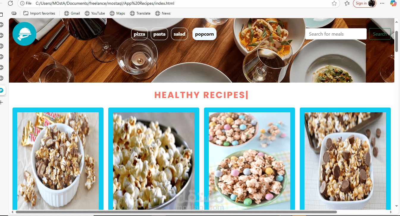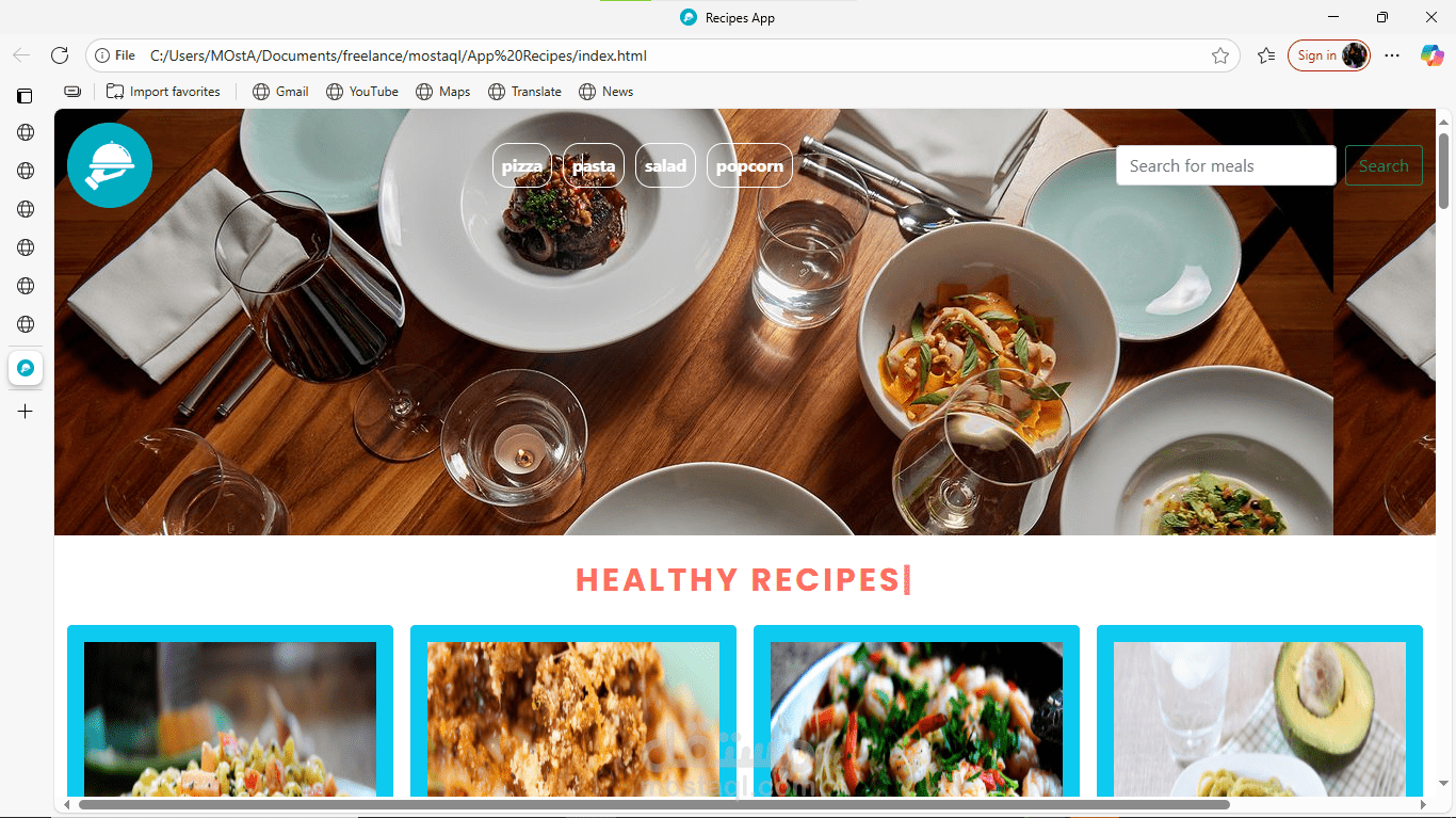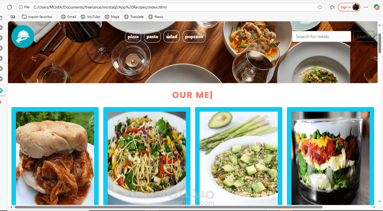 تطبيق وصفات تفاعلي متجاوب تم بناؤه بـ HTML و CSS و JavaScript و Bootstrap 5. يستخدم Forkify API لعرض الوصفات ديناميكيًا، مع نافذة تفاصيل (Modal) لكل وصفة وتصميم متجاوب وسهل الاستخدام.
