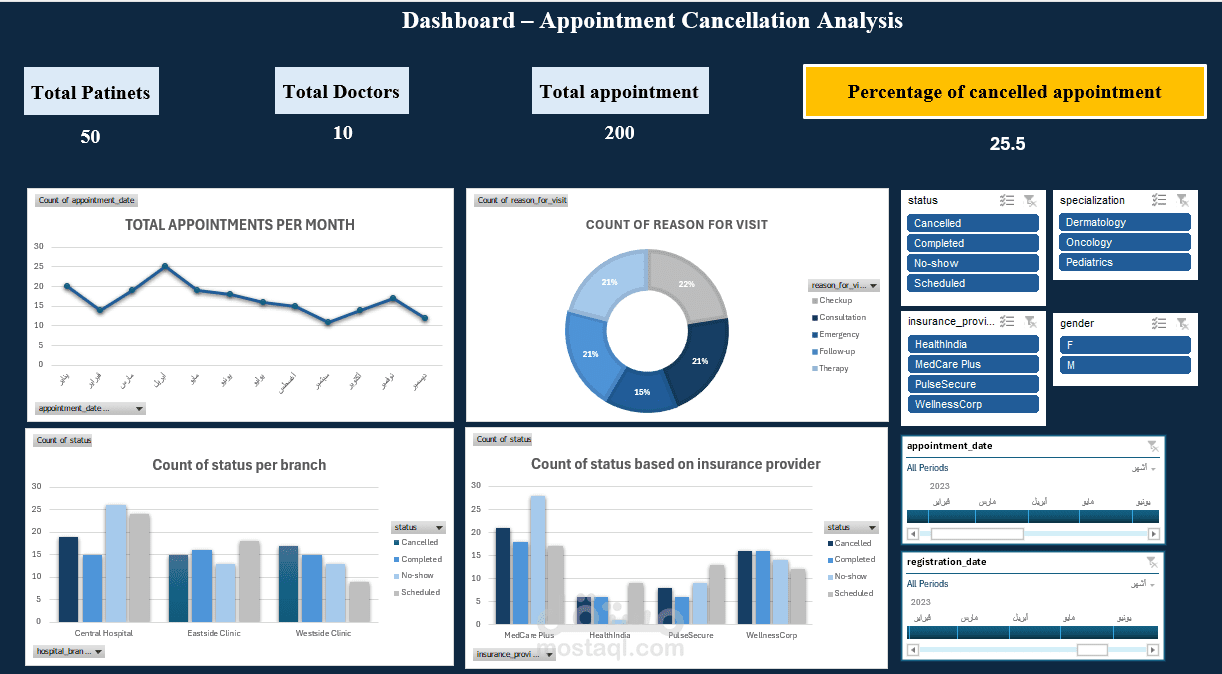 تحليل لبيانات المواعيد الطبية باستخدام Excel، داشبورد تفاعلي يوضح: