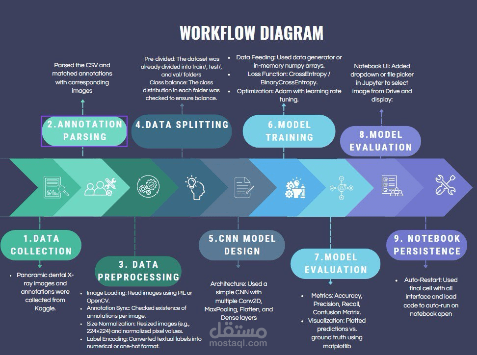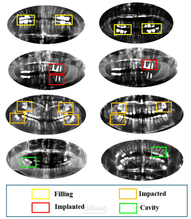 المشروع يهدف إلى تطوير نظام يعتمد على تقنيات التعلّم العميق (Deep Learning) لتشخيص أمراض الأسنان المتعددة في وقت واحد (Multi-label Classification). يقوم النموذج بتحليل صور الأشعة السينية للأسنان (Dental X-rays) لاكتشاف أكثر من اضطراب أو مشكلة في نفس الصورة، مثل: التسوس، التهاب اللثة، الحشو،. يعتمد النظام على شبكات عصبية التفافية (Convolutional Neural Networks - CNNs) لاستخراج الخصائص بدقة عالية، مما يساعد أطباء الأسنان في التشخيص السريع والدقيق ودعم اتخاذ القرار العلاجي.