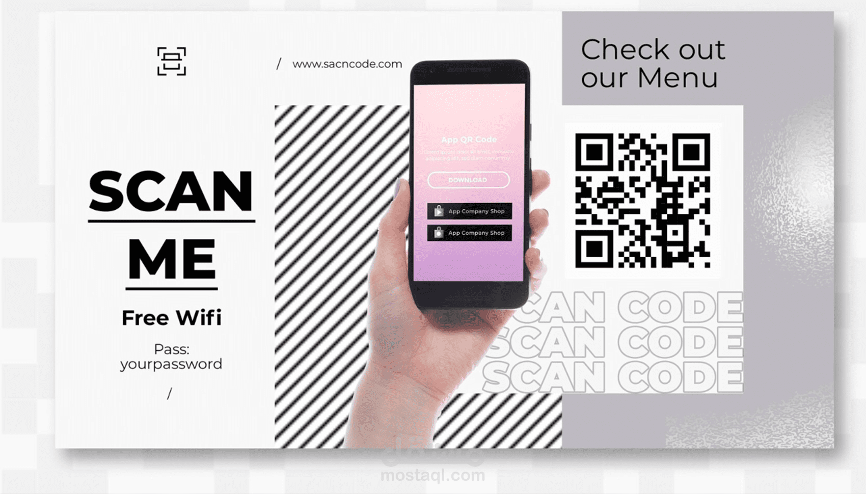 جاهز للاستخدام على البزنس كارد، الفواتير، الملصقات، البروشورات، المتاجر والمطاعم.