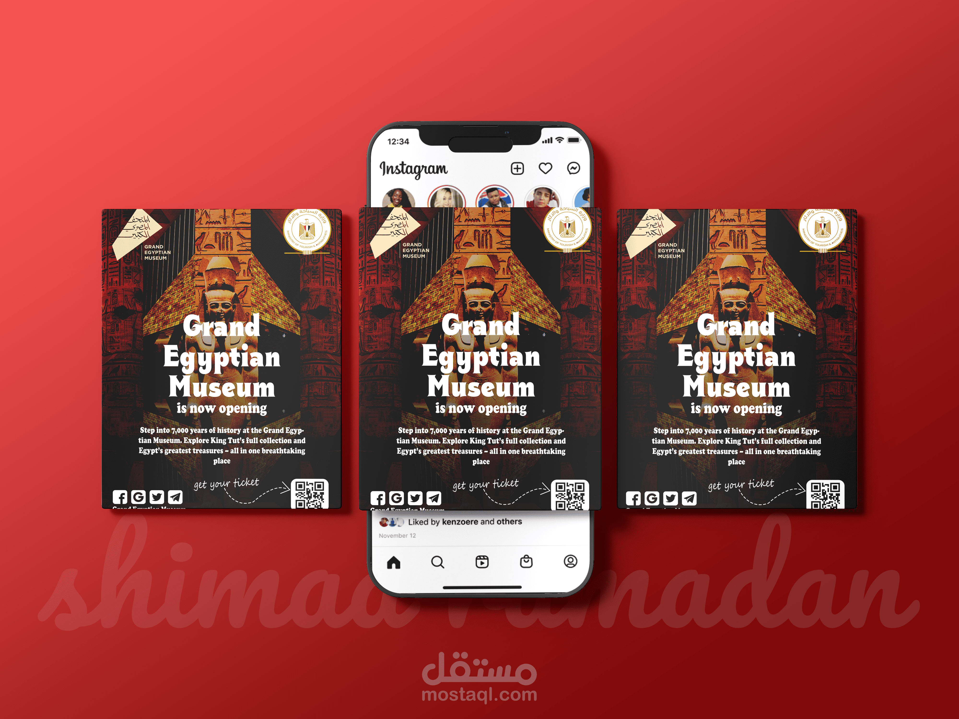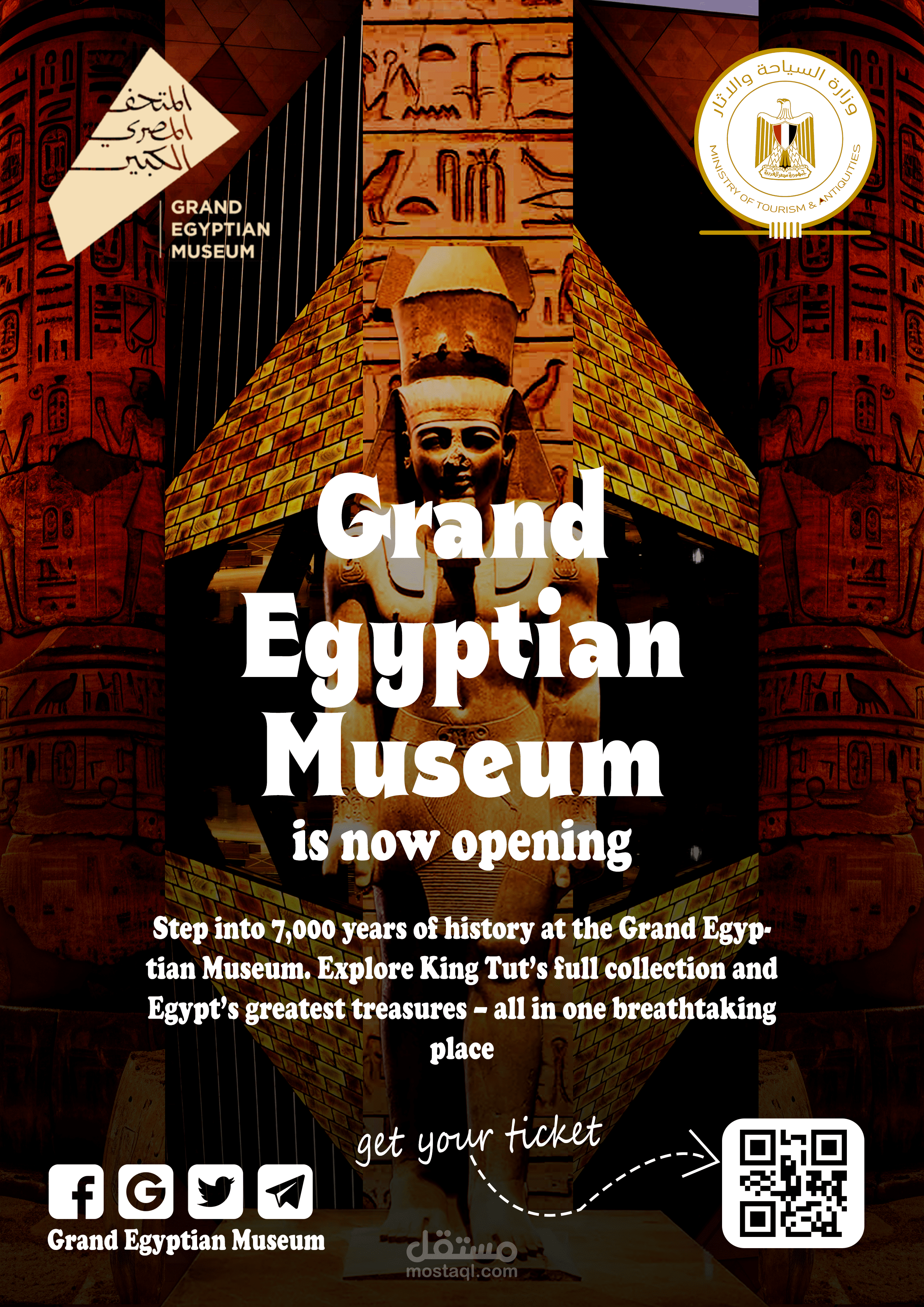 صميم دعوة افتتاح رسمية موجهة للأجانب، بلمسة تجمع بين الطابع الهندسي المنظم والهوية الفرعونية. يحتوي على تفاصيل الحدث، كود حجز، و أيقونات السوشيال ميديا.