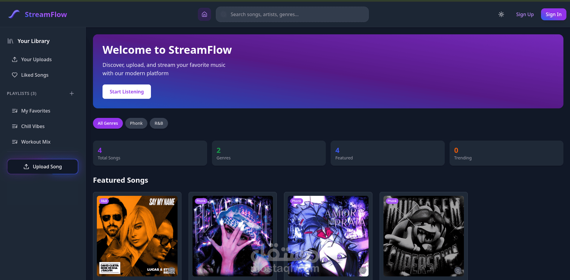 Stream Flow is a full-stack audio streaming and management platform built with Node.js, React , Express.js, and MongoDB. This production-ready application provides a complete solution for audio content creators and listeners with robust authentication, file management, and administrative controls.
