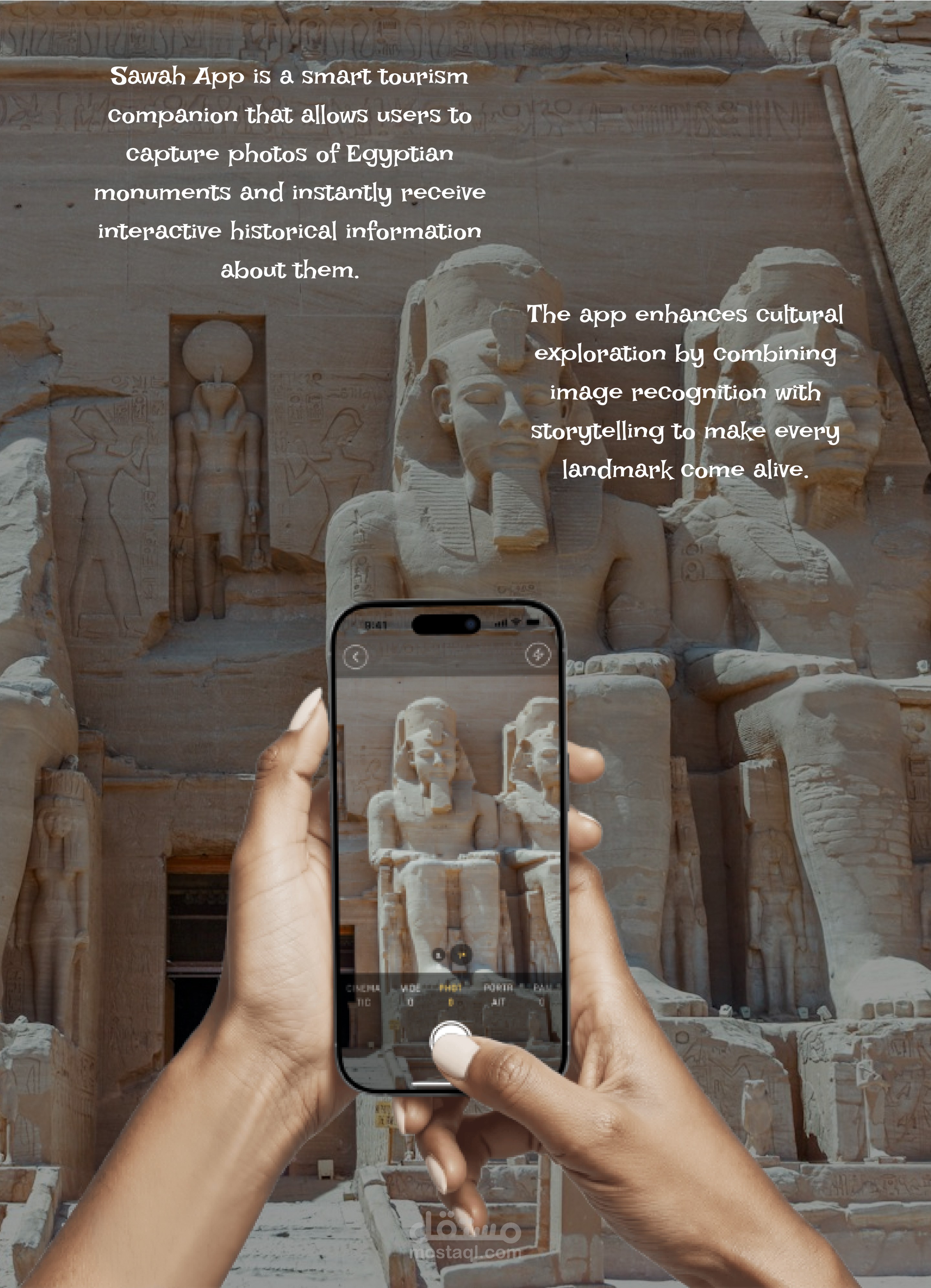 هو تطبيق مبتكر يهدف إلى مساعدة السياح على استكشاف المعالم الأثرية والتاريخية في مصر بطريقة حديثة وتفاعلية. يقوم التطبيق على فكرة التقاط صورة للآثار عبر كاميرا الهاتف ليتمكن المستخدم من التعرف عليها مباشرة والحصول على معلومات تفصيلية عنها دون الحاجة إلى مرشد سياحي.