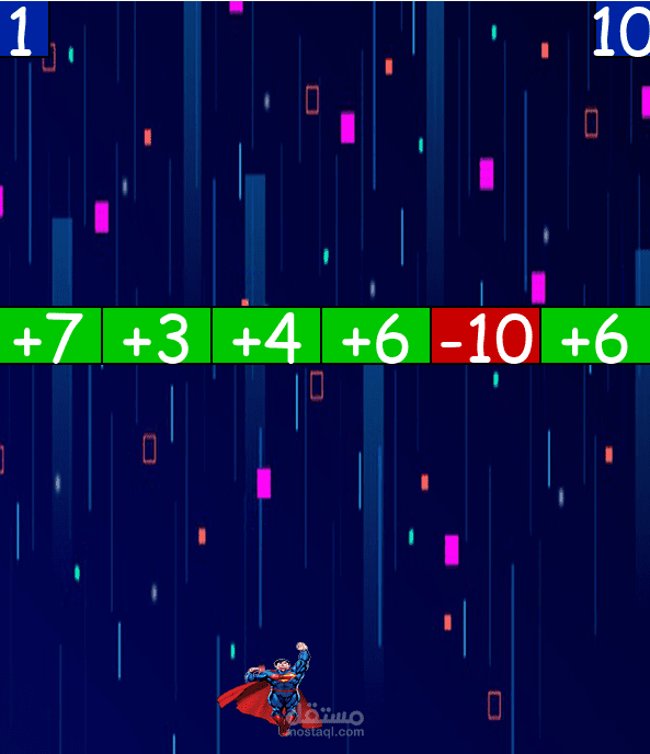 لو اخترت Start تبدأ اللعبة وفيها شخصية (سوبر مان صغير) تتحرك يمين ويسار لتستقبل أعمدة نازلة من أعلى الشاشة، كل عمود يحمل قيمة (موجبة أو سالبة). لو اصطدمت الشخصية بالعمود، يتم إضافة أو خصم النقاط من Score حسب قيمة العمود.