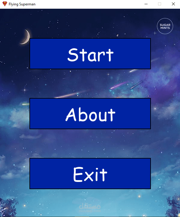 اللعبة عبارة عن واجهة رئيسية فيها أزرار (Start – About – Exit).