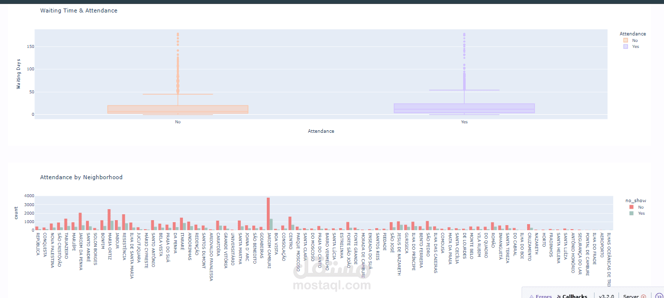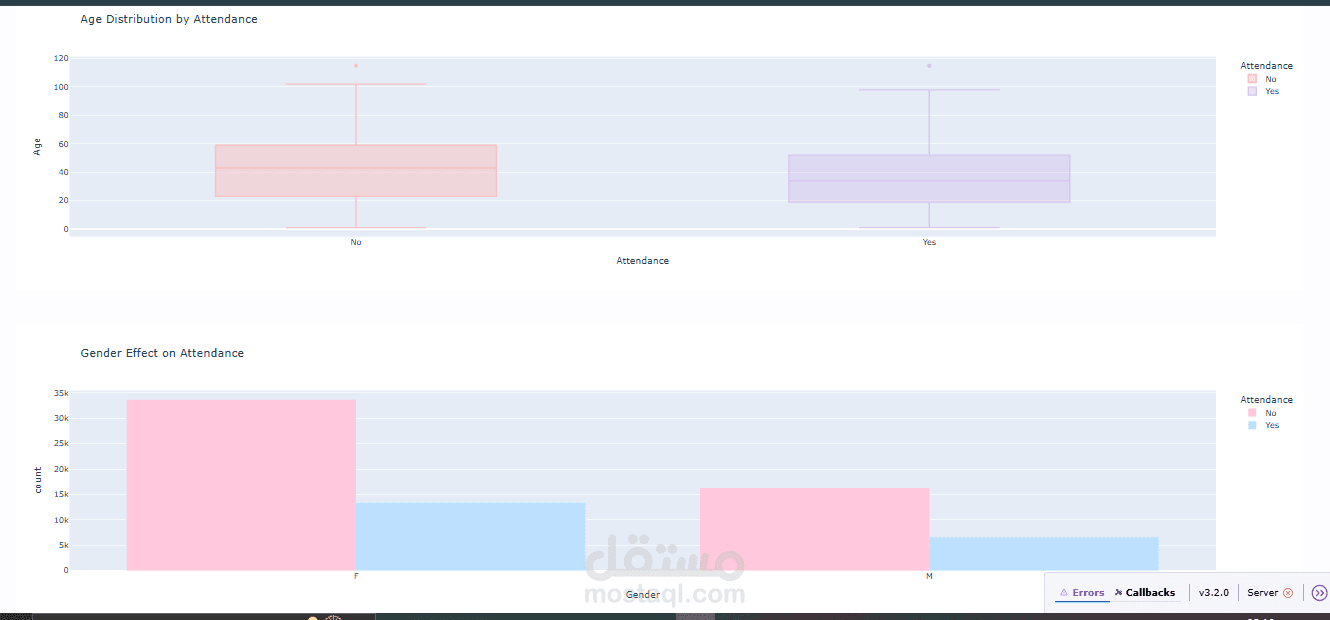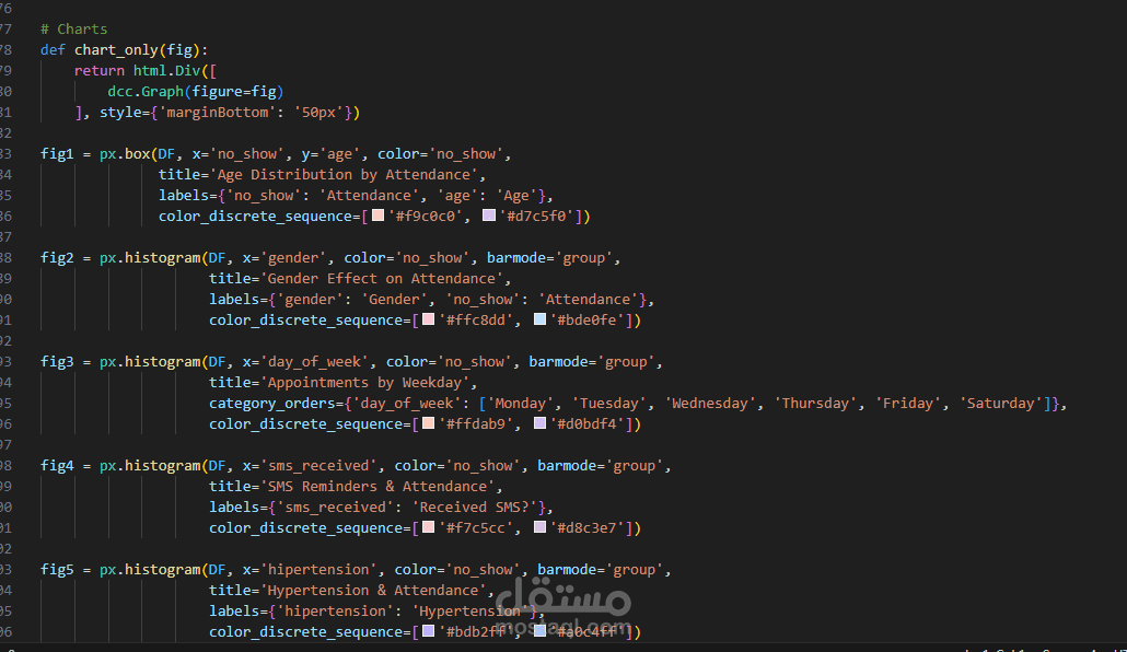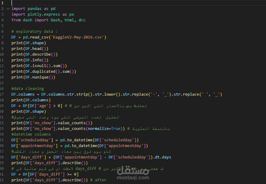 قمت بتطوير لوحة بيانات تفاعلية (Dashboard) باستخدام مكتبات Pandas، Plotly، Dash لتحليل بيانات مواعيد طبية (Medical Appointments Dataset).