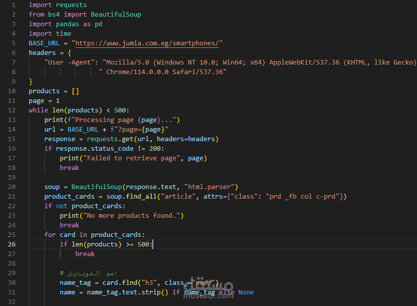 قمت بتطوير كود Web Scraping بلغة Python باستخدام مكتبات Requests، BeautifulSoup، Pandas لاستخراج بيانات الموبايلات من موقع Jumia.