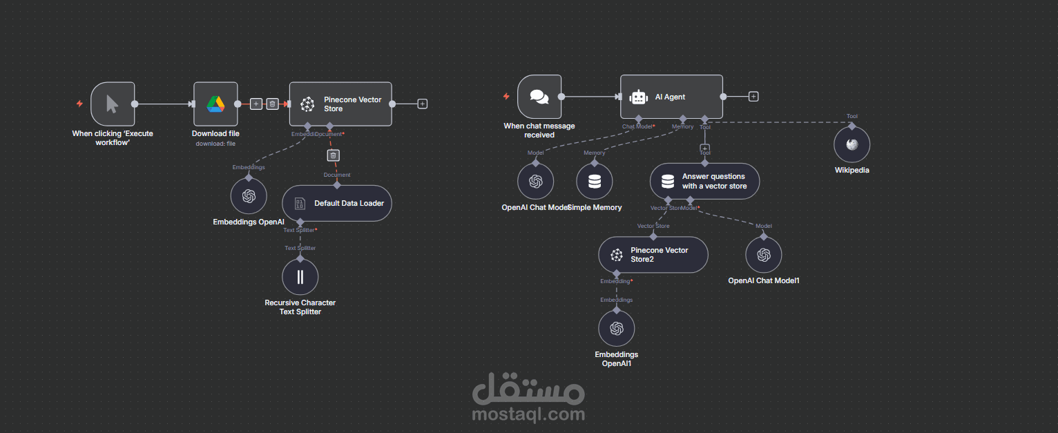 تطوير نظام ذكاء اصطناعي يعتمد على تقنية RAG (Retrieval-Augmented Generation) من خلال أداة n8n، حيث يعمل كـ Agent ذكي يقوم بدمج قدرات النماذج اللغوية مع قواعد بيانات معرفية لاسترجاع المعلومات وتوليد إجابات دقيقة. يهدف المشروع إلى بناء واجهة تفاعلية قادرة على تقديم إجابات موثوقة للمستخدمين بطريقة سلسة ومرنة، مع الاعتماد على بنية عمل آلية قابلة للتوسّع والتكامل مع مصادر بيانات مختلفة.