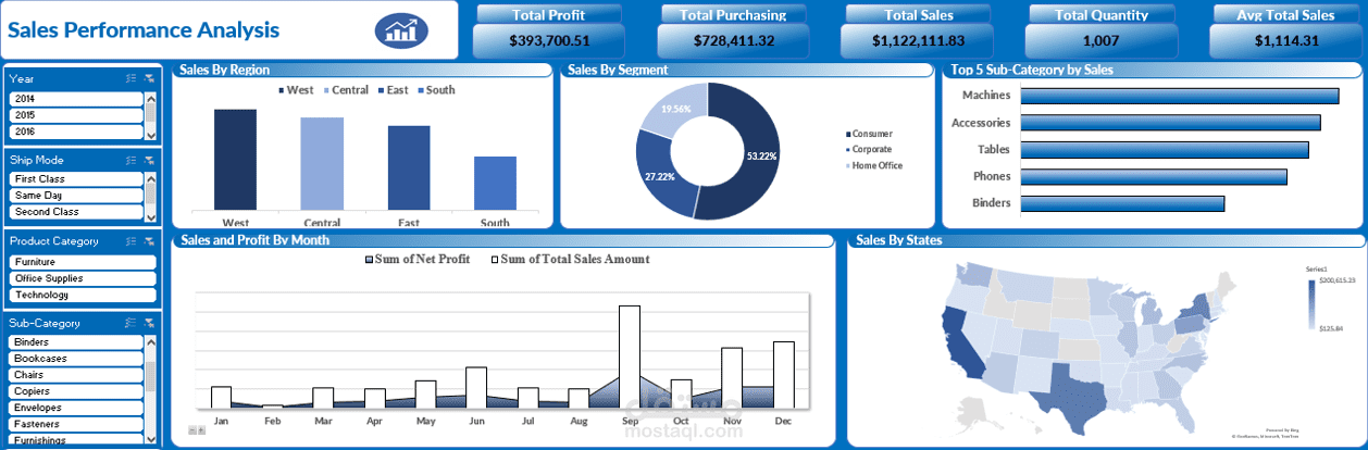 التوزيع الجغرافي: كاليفورنيا هي الولاية الرائدة في المبيعات ($457k)، تليها نيويورك ($310k).